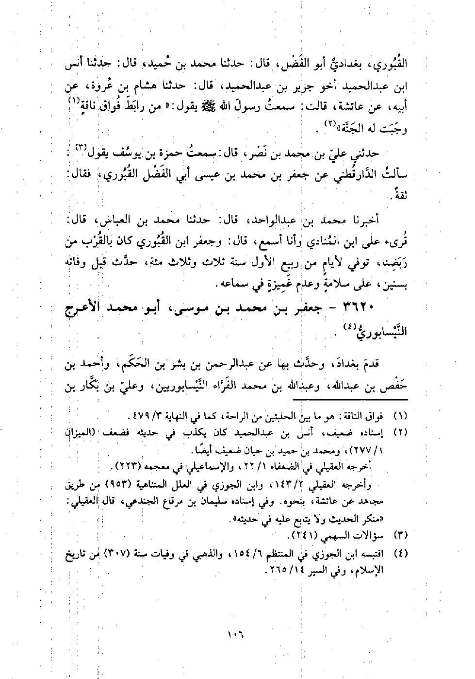 3620 - جَعْفَر بن مُحَمَّدِ بْنِ مُوسَى، أَبُو مُحَمَّد الأعرج النيسابوري قدم بغداد، وحدث بها عَنْ عَبْد الرَّحْمَنِ بن بشر بن الحكم، وأحمد بن حفص بن عَبْد اللَّهِ، وعَبْد اللَّهِ بْن مُحَمَّد الفراء النيسابوريين، وعلي بن بكار بن هارون المصيصي، وأحمد بن محمد بن بكار بن بلال الدمشقي.