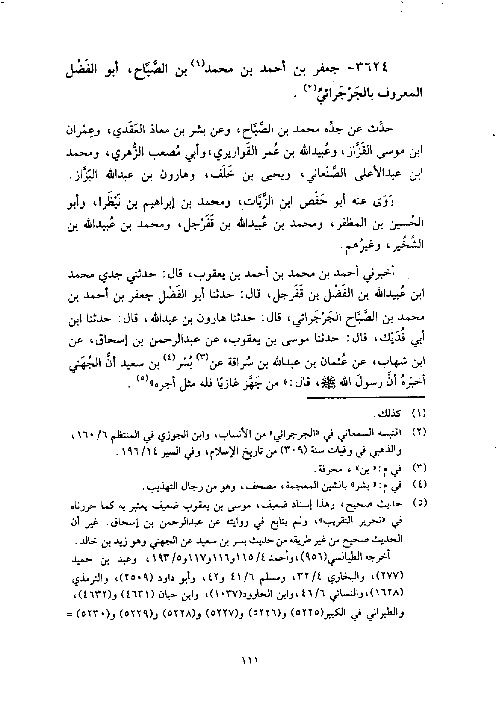 3624 - جَعْفَر بن أَحْمَدَ بْنِ محمد بن الصباح، أَبُو الفضل المعروف بالجرجرائي حدث عَنْ جده مُحَمَّد بن الصباح، عَنْ بشر بن معاذ العقدي، وعمران بن مُوسَى القزاز، وعُبَيْد اللَّهِ بن عُمَر القواريري، وأبي مصعب الزهري، ومحمد بن عبد الأعلى الصنعاني، ويحيى بن خلف، وهارون بن عَبْد اللَّهِ البزاز.