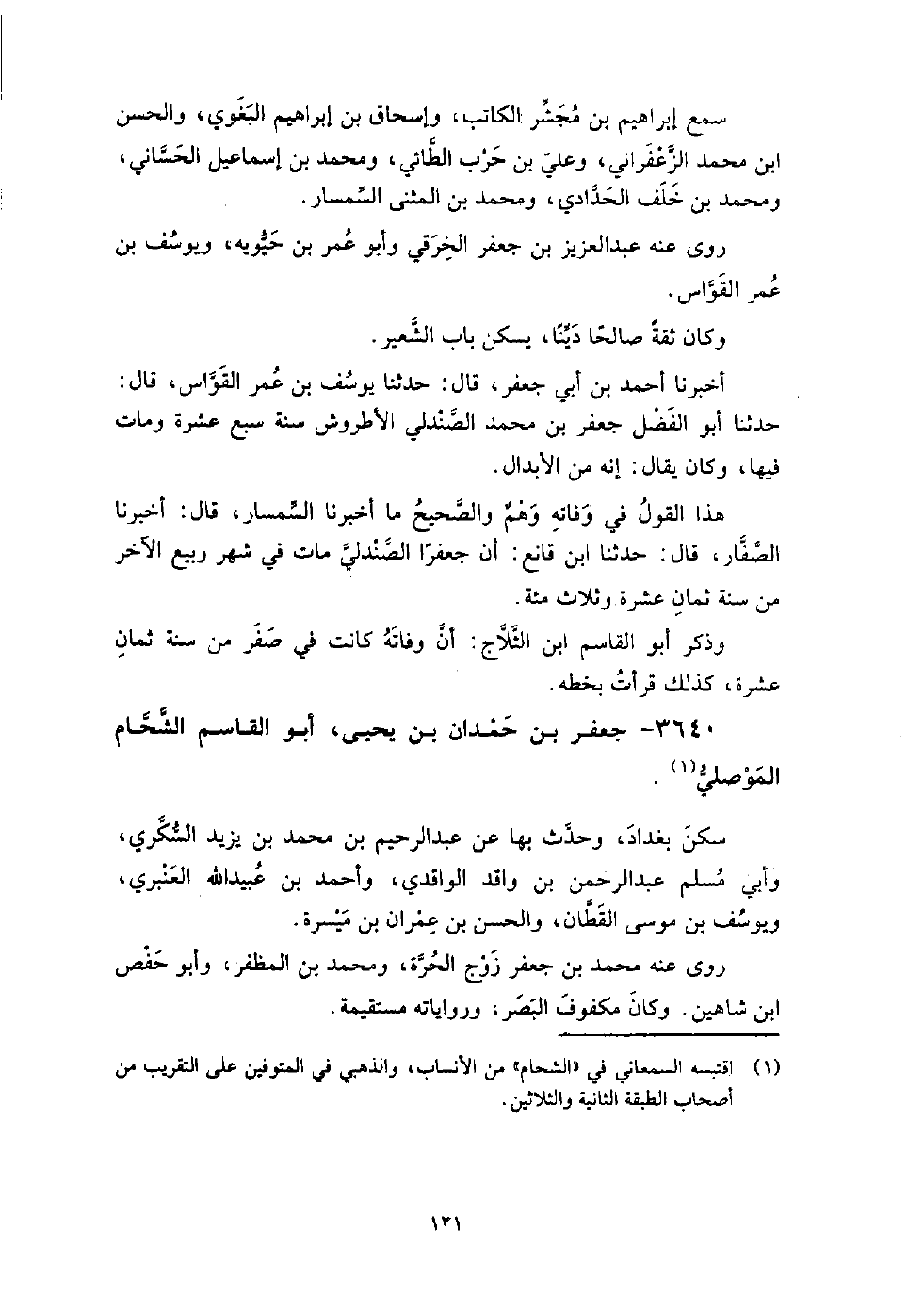 3640 - جَعْفَر بن حمدان بن يَحْيَى أَبُو الْقَاسِمِ الشحام الموصلي سكن بغداد، وحدث بها عَنْ عبد الرحيم بن مُحَمَّدِ بْنِ يزيد السكري، وأبي مسلم عَبْد الرَّحْمَنِ بن واقد الواقدي، وأحمد بن عُبَيْد اللَّهِ العنبري، ويوسف بن مُوسَى القطان، والحسن بن عمران بن ميسرة.