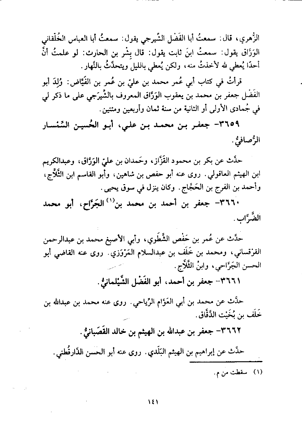 3659 - جَعْفَر بن مُحَمَّدِ بْنِ عَلِيّ أَبُو الْحُسَيْنِ السمسار الرصافي حدث عَنْ بكر بن محمود القزاز، وحمدان بن عَلِيّ الْوَرَّاق، وعبد الكريم بن الهيثم العاقولي.