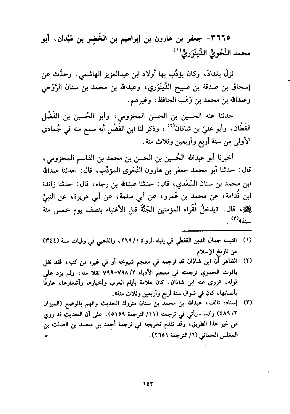 3665 - جَعْفَر بن هارون بن إِبْرَاهِيم بن الحضر بن ميدان أَبُو مُحَمَّد النحوي الدينوري نزل بغداد، وكان يؤدب بها أولاد بن العزيز الهاشمي.