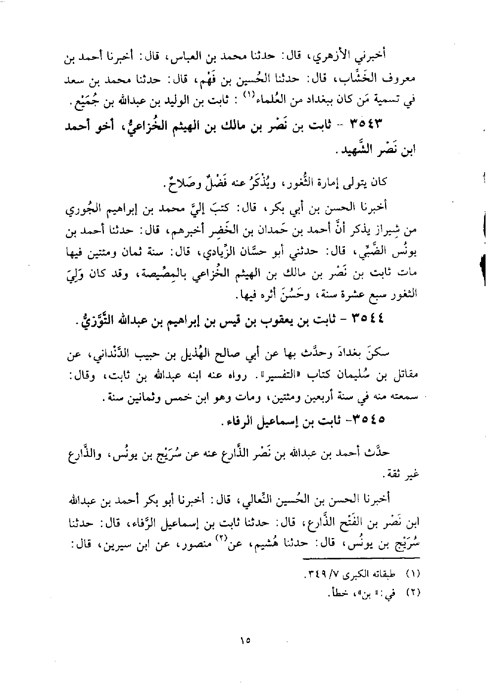 3543 - ثابت بن نصر بن مالك بن الهيثم الخزاعي أخو أحمد بن نصر الشهيد كان يتولى إمارة الثغور، ويذكر عنه فضل وصلاح.