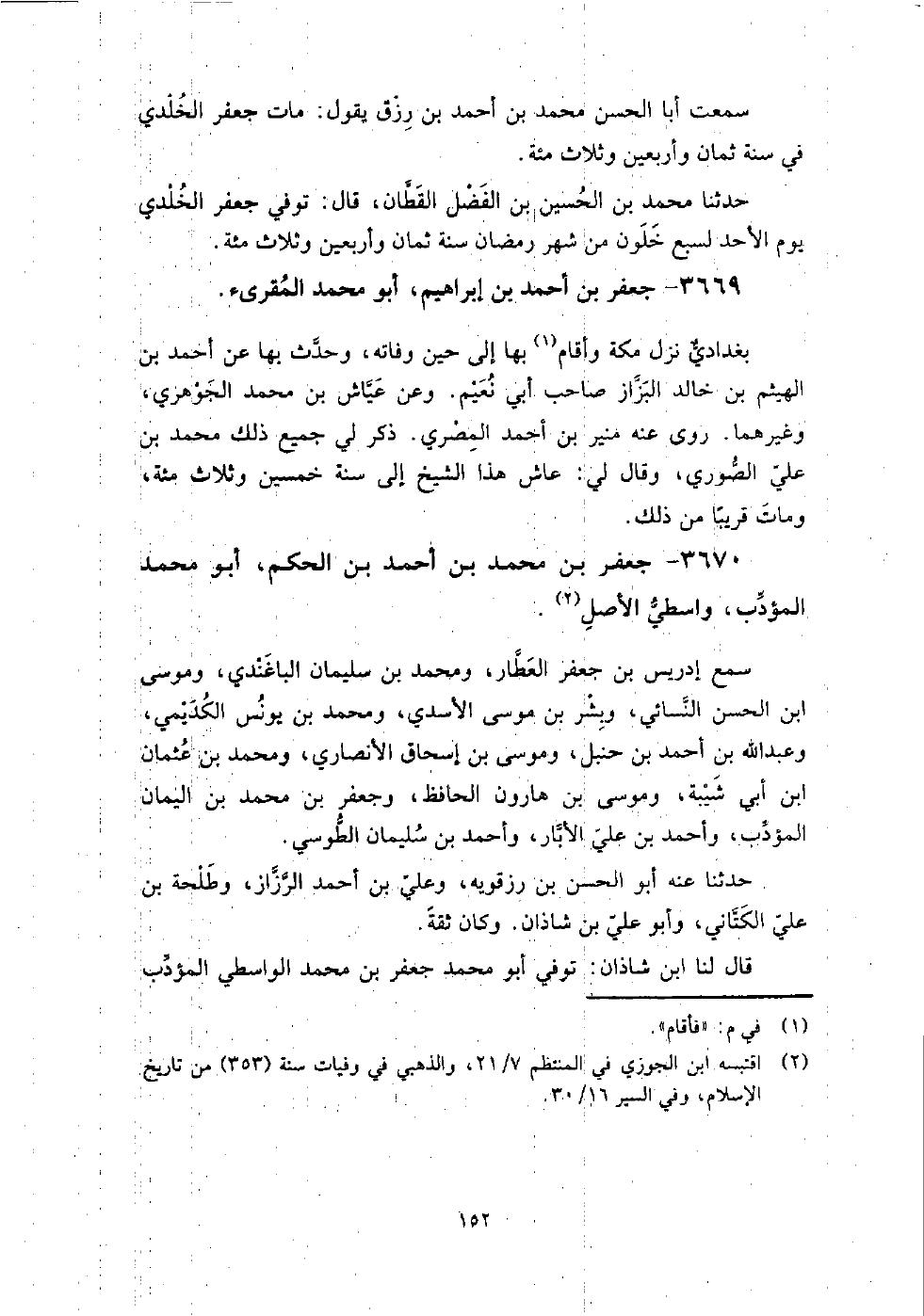 3670 - جَعْفَر بن مُحَمَّدِ بْنِ أَحْمَدَ بْنِ الحكم أَبُو مُحَمَّد المؤدب واسطي الأصل سمع إدريس بن جَعْفَر العطار، ومحمد بن سُلَيْمَان الباغندي، وموسى بن الْحَسَن النسائي، وبشر بن مُوسَى الأسدي، ومحمد بن يونس الكديمي، وعَبْد اللَّهِ بْن أَحْمَدَ بْنِ حنبل، وموسى بن إِسْحَاق الأنصاري، ومحمد بن عُثْمَان بن أَبِي شيبة، وموسى بن هارون الحافظ، وجعفر بن مُحَمَّدِ بْنِ اليمان المؤدب، وأحمد بن عَلِيّ الأبار، وأحمد بن سُلَيْمَان الطوسي.