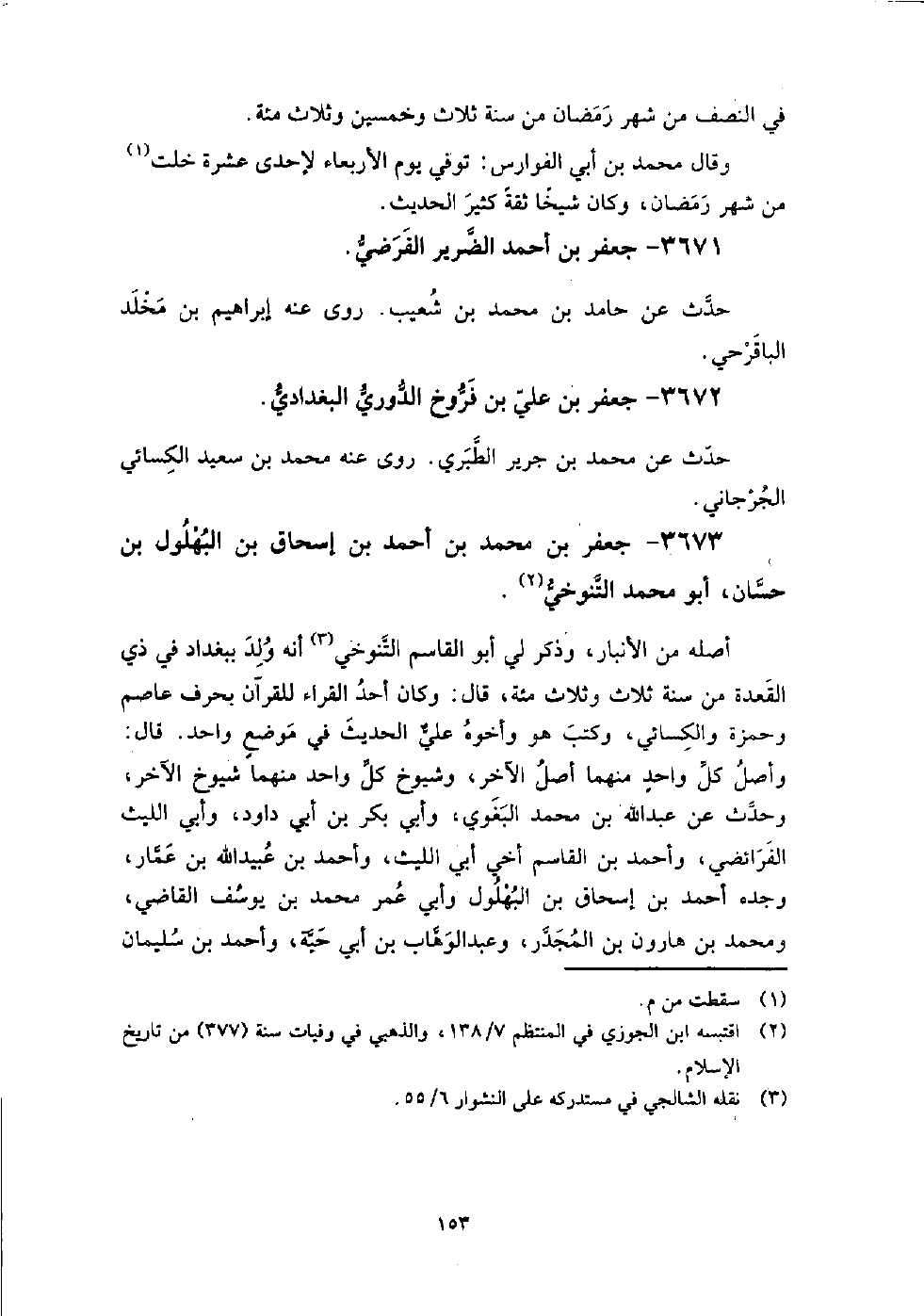 3672 - جَعْفَر بن عَلِيّ بن فروخ الدوري الْبَغْدَادِيّ حدث عَنْ مُحَمَّد بن جرير الطبري.