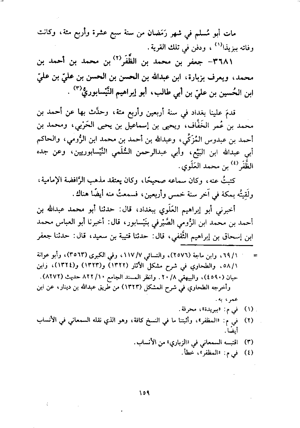 3681 - جَعْفَر بن مُحَمَّدِ بْنِ الظفر بن مُحَمَّدِ بْنِ أَحْمَدَ بْنِ مُحَمَّد، ويعرف بزبارة بن عَبْدِ اللَّهِ بْنِ الْحَسَن بن الْحَسَن بن عَلِيّ بن عَلِيّ بن الْحُسَيْن بن عَلِيّ بن أَبِي طالب أَبُو إِبْرَاهِيم النيسابوري