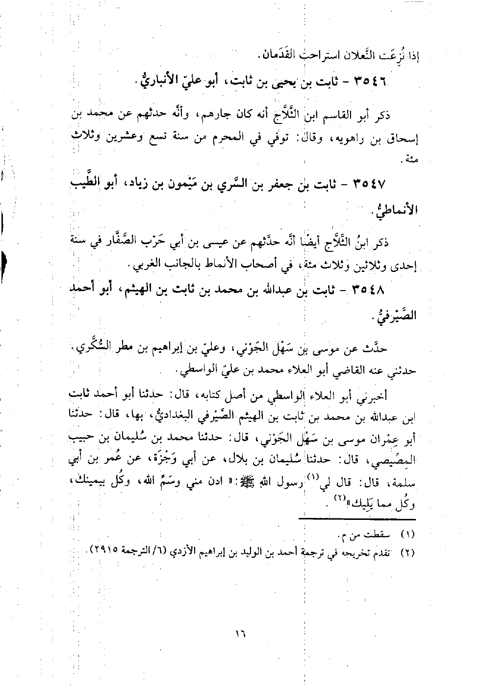 3547 - ثابت بن جعفر بن السري بن ميمون بن زياد أَبُو الطيب الأنماطي ذكر ابن الثلاج، أيضا، أنه حدثهم عَنْ عِيسَى بن أبي حرب الصفار فِي سنة إحدى وثلاثين وثلاث مائة فِي أصحاب الأنماط بالجانب الغربي