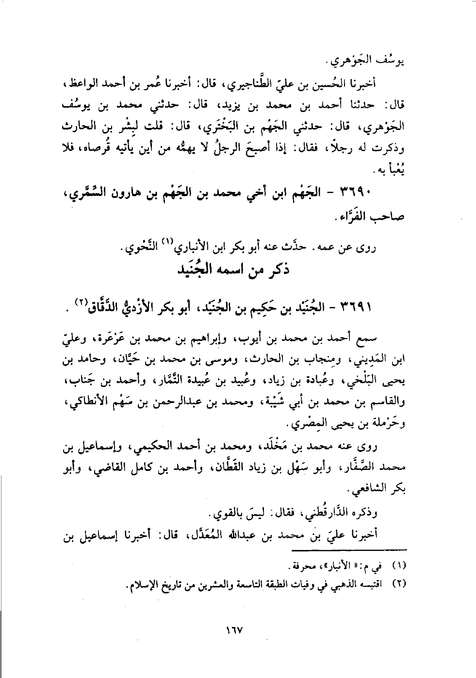 3691 - الجنيد بن حكيم بن الجنيد أَبُو بَكْرٍ الأزدي الدَّقَّاق سمع أَحْمَد بن مُحَمَّدِ بْنِ أيوب، وإبراهيم بن مُحَمَّدِ بْنِ عرعرة، وعلي ابن المديني، ومنجاب بن الحارث، وموسى بن مُحَمَّدِ بْنِ حيان، وحامد بن يَحْيَى البلخي، وعبادة بن زياد، وعبيد بن عبيدة التمار، وأحمد بن جناب، والقاسم بن مُحَمَّدِ بْنِ أَبِي شيبة، ومحمد بن عَبْد الرَّحْمَنِ بن سهم الأنطاكي، وحرملة بن يَحْيَى المصري.