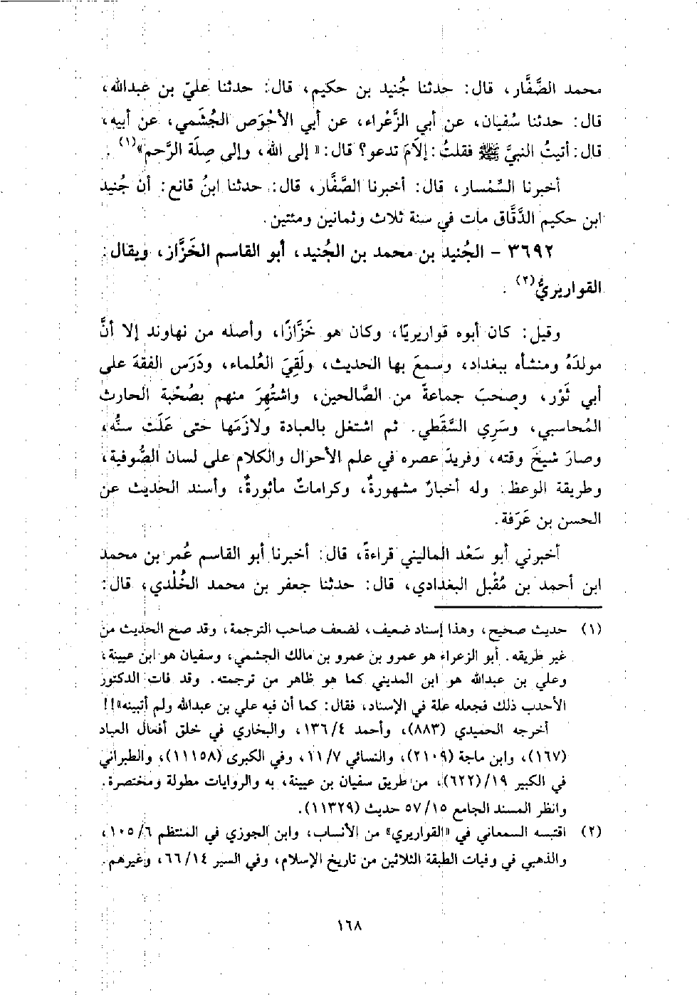 3692 - الجنيد بن مُحَمَّدِ بْنِ الجنيد أَبُو الْقَاسِمِ الخزاز ويقال القواريري وقيل: كان أبوه قواريريا، وكان هو خزازا، وأصله من نهاوند إلا أن مولده ومنشأه ببغداد، وسمع بها الحديث، ولقي العلماء، ودرس الفقه عَلَى أَبِي ثور، وصحب جماعة من الصالحين، واشتهر منهم بصحبة الحارث المحاسبي، وسري السقطي.