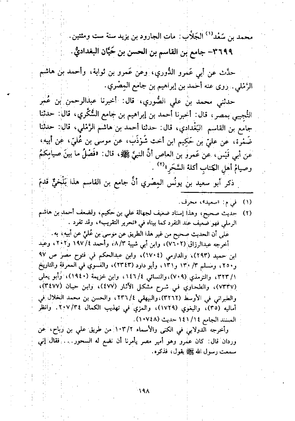 (2382) -[8: 198] حَدَّثَنِي مُحَمَّدُ بْنُ عَلِيٍّ الصُّورِيُّ، قَالَ: أَخْبَرَنَا عَبْدُ الرَّحْمَنِ بْنُ عُمَرَ التَّجِيبِيُّ، بِمِصْرَ، قَالَ: أَخْبَرَنَا أَحْمَدُ بْنُ إِبْرَاهِيمَ بْنِ جَامِعٍ السُّكَّرِيُّ، قَالَ: حَدَّثَنَا جَامِعُ بْنُ الْقَاسِمِ الْبَغْدَادِيُّ، قَالَ: حَدَّثَنَا أَحْمَدُ بْنُ هَاشِمٍ الرَّمْلِيُّ، قَالَ: حَدَّثَنَا ضَمْرَةُ، عَنْ عَلِيِّ بْنِ حَكِيمِ ابْنِ أُخْتِ شَوْذَبٍ، عَنْ مُوسَى بْنِ عَلِيٍّ، عَنْ أَبِيهِ، عَنْ أَبِي قَيْسٍ، عَنْ عَمْرِو بْنِ الْعَاصِ، أَنَّ النَّبِيَّ صَلَّى اللَّهُ عَلَيْهِ وَسَلَّمَ قَالَ: " فَصْلُ مَا بَيْنَ صِيَامِكُمْ وَصِيَامِ أَهْلِ الْكِتَابِ أَكْلَةُ السَّحَرِ " ذكر أَبُو سعيد بن يونس المصري أن جامع بن القاسم هذا بلخي قدم مصر، وحدث بها، وَقَالَ: توفي بمصر فِي سنة ست وثمانين ومائتين.