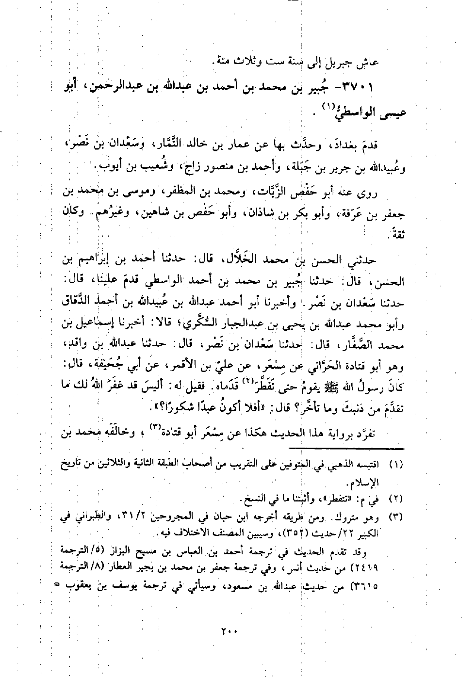 3701 - جبير بن مُحَمَّدِ بْنِ أَحْمَدَ بْنِ عَبْد اللَّهِ بْن عَبْد الرَّحْمَنِ أَبُو عِيسَى الواسطي قدم بغداد، وحدث بها عَنْ عمار بن خالد التمار، وسعدان بن نصر، وعُبَيْد اللَّهِ بن جرير بن جبلة، وأحمد بن مَنْصُور زاج، وشعيب بن أيوب.