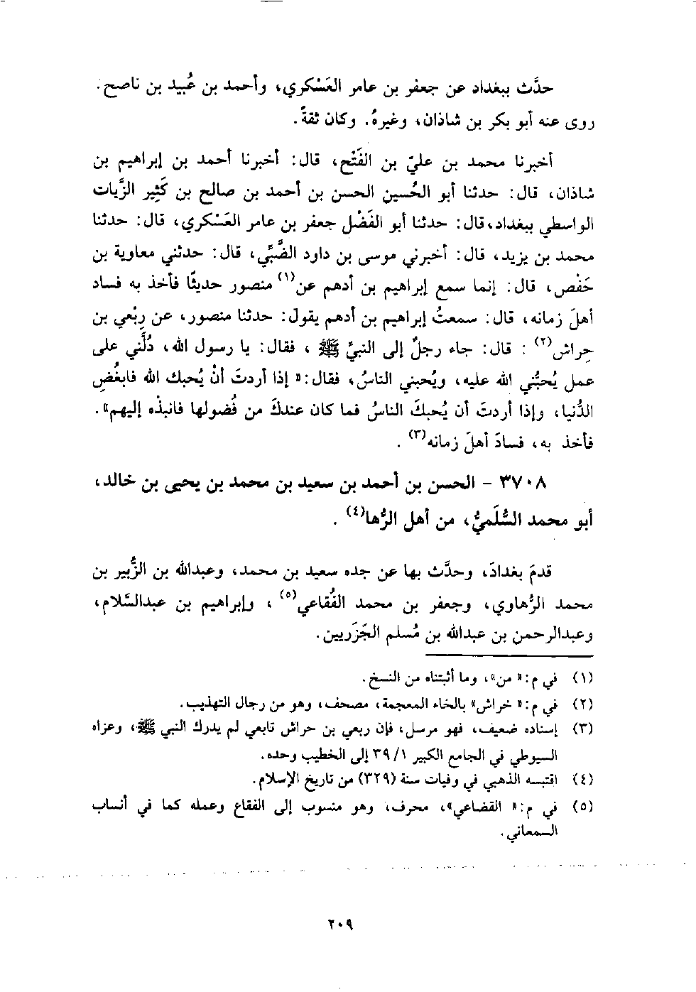 3708 - الْحَسَن بن أَحْمَدَ بْنِ سعيد بن مُحَمَّدِ بْنِ يَحْيَى بن خالد أَبُو مُحَمَّد السلمي من أهل الرها قدم بغداد، وحدث بها عَنْ جده سعيد بن مُحَمَّد، وعَبْد اللَّهِ بْن الزبير بن مُحَمَّد الرهاوي، وجعفر بن مُحَمَّد الفقاعي، وإبراهيم بن عبد السلام، وعَبْد الرَّحْمَنِ بن عَبْدِ اللَّهِ بْنِ مسلم الجزريين.
