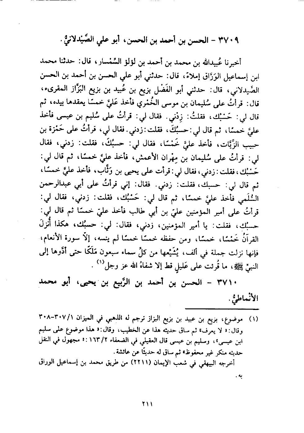 3709 - الْحَسَن بن أَحْمَدَ بْنِ الْحَسَن أَبُو عَلِيّ الصيدلاني أخبرنا عُبَيْدُ اللَّهِ بْنُ مُحَمَّدِ بْنِ أَحْمَدَ بْنِ لُؤْلُؤٍ السِّمْسَارُ، قَالَ: حَدَّثَنَا مُحَمَّدُ بْنُ إِسْمَاعِيلَ الْوَرَّاقُ، إِمْلاءً، قَالَ: حَدَّثَنِي أَبُو عَلِيٍّ الْحَسَنُ بْنُ أَحْمَدَ بْنِ الْحَسَنِ الصَّيْدَلانِيُّ، قَالَ: حَدَّثَنِي أَبُو الْفَضْلِ بَزِيعُ بْنُ عُبَيْدِ بْنِ بَزِيعٍ الْبَزَّازُ الْمُقْرِئُ، قَالَ: قرأت عَلَى سُلَيْمَانَ بْنِ مُوسَى الْخَمْرِيُّ فَأَخَذَ عَلِيَّ خَمْسًا يَعْقِدُهَا بِيَدِهِ، ثُمَّ قَالَ لي: حسبك، فقلت: زدني، فَقَالَ لي: قرأت عَلَى سليم بن عِيسَى فأخذ عَلِيّ خمسا، ثم قَالَ لي: حسبك، فقلت: زدني، فَقَالَ لي، قرأت عَلَى حمزة بن حبيب الزيات، فأخذ عَلَى خمسا، فَقَالَ لي: حسبك، فقلت: زدني، فَقَالَ لي: قرأت عَلَى سُلَيْمَان بن مهران الأعمش، فأخذ عَلِيّ خمسا، ثم قَالَ لي: حسبك، فقلت: زدني، فَقَالَ لي: قرأت عَلَى يَحْيَى بن وثاب، فأخذ عَلَى خمسا، ثم قَالَ لي: حسبك، فقلت: زدني، فَقَالَ: إني قرأت عَلَى أَبِي عَبْد الرَّحْمَنِ السلمي فأخذ عَلَى خمسا، ثم قَالَ لي: حسبك، فقلت: زدني، فَقَالَ لي: قرأت عَلَى أمير المؤمنين عَلِيّ بن أَبِي طالب فأخذ عَلِيّ خمسا، ثم قَالَ لي: حسبك، فقلت: يا أمير المؤمنين، زدني، فَقَالَ لي: حسبك، هكذا أنزل القرآن خمسا، خمسا، ومن حفظه خمسا خمسا لم ينسه، إلا سورة الأنعام، فإنها نزلت جملة فِي ألف يشيعها من كل سماء سبعون ملكا حتى أدوها إِلَى النَّبِيّ صَلَّى اللَّهُ عَلَيْهِ وَسَلَّمَ ما قرئت عَلَى عليل قط إلا شفاه اللَّه عَزَّ وَجَلَّ