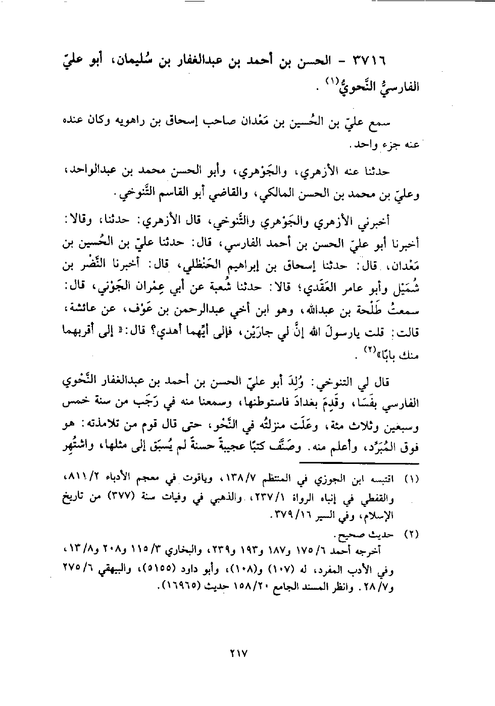 (2393) -[8: 217] أَخْبَرَنِي الأَزْهَرِيُّ وَالْجَوْهَرِيُّ وَالتَّنُوخِيُّ، قَالَ الأَزْهَرِيُّ: حَدَّثَنَا، وَقَالا أَخْبَرَنَا أَبُو عَلِيٍّ الْحَسَنُ بْنُ أَحْمَدَ الْفَارِسِيُّ، قَالَ: حَدَّثَنَا عَلِيُّ بْنُ الْحُسَيْنِ بْنِ مَعْدَانَ، قَالَ: حَدَّثَنَا إِسْحَاقُ بْنُ إِبْرَاهِيمَ الْحَنْظَلِيُّ، قَالَ: أَخْبَرَنَا النَّضْرُ بْنُ شُمَيْلٍ وَأَبُو عَامِرٍ الْعَقَدِيُّ، قَالا: حَدَّثَنَا شُعْبَةُ عَنْ أَبِي عِمْرَانَ الْجَوْنِيُّ، قَالَ: سَمِعْتُ طَلْحَةَ بْنَ عَبْدِ اللَّهِ وَهُوَ ابْنُ أَخِي عَبْدِ الرَّحْمَنِ بْنِ عَوْفٍ، عَنْ عَائِشَةَ، قَالَتْ: قُلْتُ: يَا رَسُولَ اللَّهِ، إِنَّ لِي جَارَيْنِ، فَإِلَى أَيُّهُمَا أُهْدِيَ؟ قَالَ: " إِلَى أَقْرَبِهِمَا مِنْكِ بَابًا " قَالَ لِي التَّنُوخِيُّ: ولد أَبُو عَلِيّ الْحَسَن بن أَحْمَدَ بْنِ عبد الغفار النحوي الفارسي بفسا، وقدم بغداد فاستوطنها، وسمعنا منه فِي رجب سنة خمس وسبعين وثلاث مائة، وعلت منزلته فِي النحو، حتى قَالَ قوم من تلامذته: هو فوق المبرد، وأعلم منه.