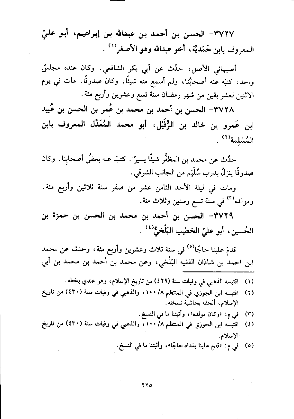 3729 - الْحَسَن بن أَحْمَدَ بْنِ مُحَمَّد بن الْحَسَن بن حمزة بن الْحُسَيْن أَبُو عَلِيّ الخطيب البلخي قدم علينا حاجا فِي سنة ثلاث وعشرين وأربع مائة، وحدثنا عَنْ مُحَمَّد بن أَحْمَدَ بْنِ شاذان الفقيه البلخي، وعن مُحَمَّد بن أَحْمَدَ بْنِ مُحَمَّد بن أَبِي صالح الْبَغْدَادِيّ نزيل بلخ.