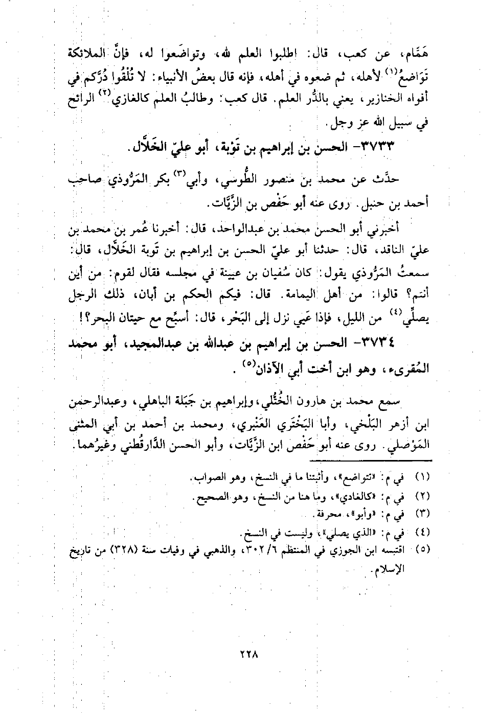 3733 - الْحَسَن بن إِبْرَاهِيم بن توبة أَبُو عَلِيّ الخلال حدث عَنْ مُحَمَّد بن مَنْصُور الطوسي، وأبي بكر المروذي صاحب أَحْمَد بن حنبل.
