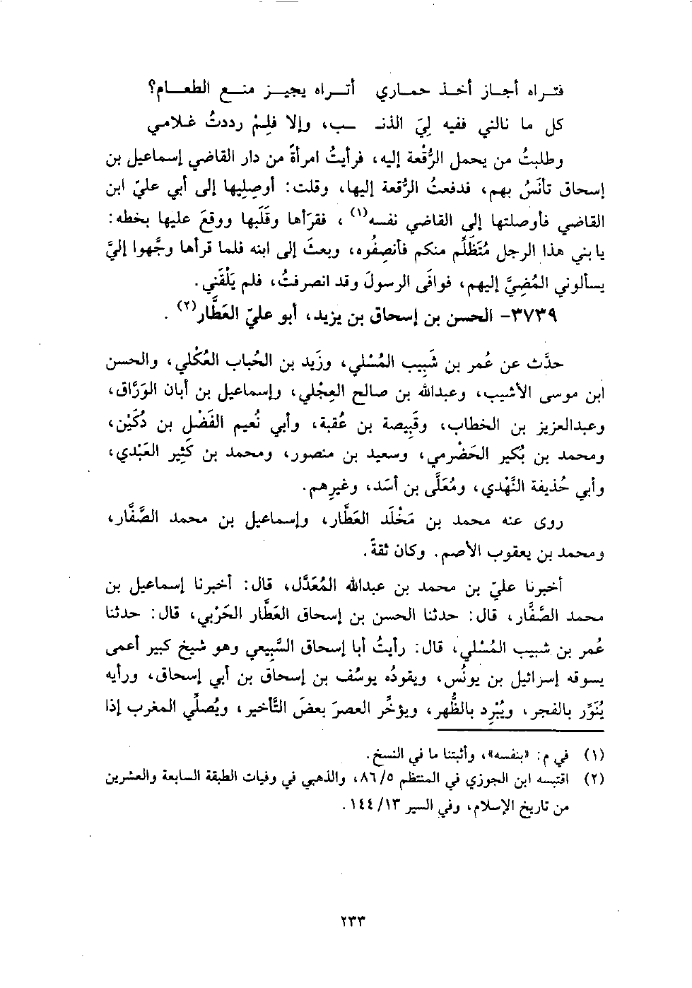 3739 - الْحَسَن بن إِسْحَاق بن يزيد أَبُو عَلِيّ العطار حدث عَنْ عُمَر بن شبيب المسلي، وزيد بن الحباب العكلي، والحسن بن مُوسَى الأشيب، وعَبْد اللَّهِ بْن صالح العجلي، وإسماعيل بن أبان الْوَرَّاق، وعبد العزيز بن الخطاب، وقبيصة بن عقبة، وأبي نعيم الفضل بن دكين، ومحمد بن بكير الحضرمي، وسعيد بن مَنْصُور، ومحمد بن كثير العبدي، وأبي حذيفة النهدي، ومعلى بن أسد، وغيرهم.