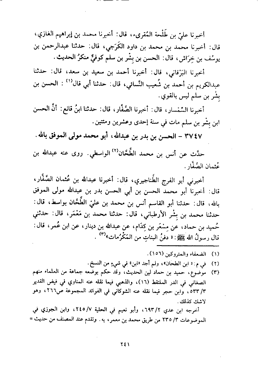 (2409) -[8: 241] أَخْبَرَنِي أَبُو الْفَرَجِ الطَّنَاجِيرِيُّ، قَالَ: أَخْبَرَنَا عَبْدُ اللَّهِ بْنُ عُثْمَانَ الصَّفَّارُ، قَالَ: أَخْبَرَنَا أَبُو مُحَمَّدٍ الْحَسَنُ بْنُ أَبِي الْحَسَنِ بَدْرُ بْنُ عَبْدِ اللَّهِ مَوْلَى الْمُوَفَّقِ بِاللَّهِ، قَالَ: حَدَّثَنَا أَبُو الْقَاسِمِ أَنَسُ بْنُ مُحَمَّدِ بْنِ عَلِيٍّ الطَّحَّانُ، بِوَاسِطَ، قَالَ: حَدَّثَنَا مُحَمَّدُ بْنُ بِشْرٍ الأَرْطُبَانِيُّ، قَالَ: حَدَّثَنَا مُحَمَّدُ بْنُ مَعْمَرٍ، قَالَ: حَدَّثَنِي حُمَيْدُ بْنُ حَمَّادٍ، عَنْ مِسْعَرِ بْنِ كِدَامٍ، عَنْ عَبْدِ اللَّهِ بْنِ دِينَارٍ، عَنِ ابْنِ عُمَرَ، قَالَ: قَالَ رَسُولُ اللَّهِ صَلَّى اللَّهُ عَلَيْهِ وَسَلَّمَ: " دَفْنُ الْبَنَاتِ مِنَ الْمَكْرُمَاتِ "