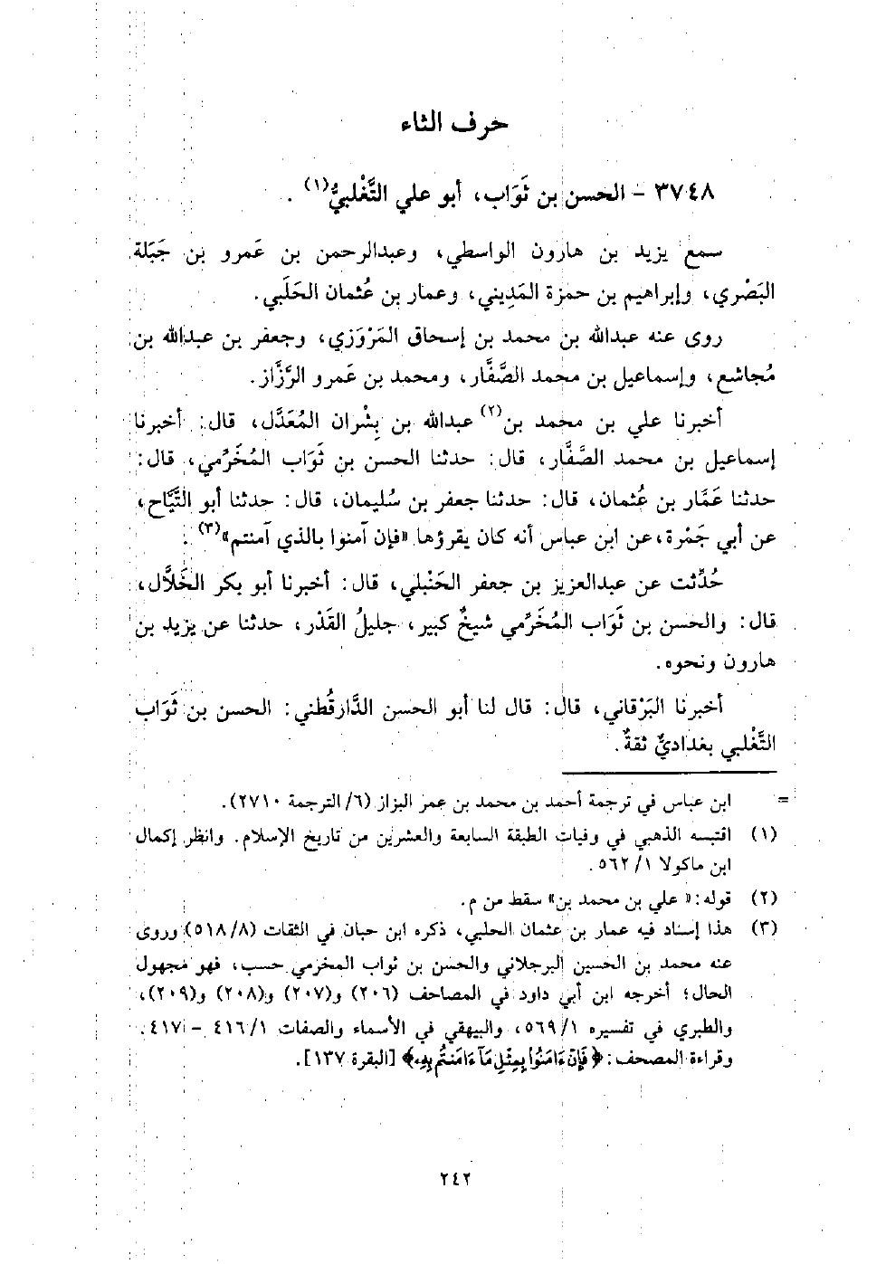 3748 - الْحَسَن بن ثواب أَبُو عَلِيّ التغلبي سمع يزيد بن هارون الواسطي، وعَبْد الرَّحْمَنِ بن عَمْرِو بْنِ جبلة البصري، وإبراهيم بن حمزة المديني، وعمار بن عُثْمَان الحلبي.