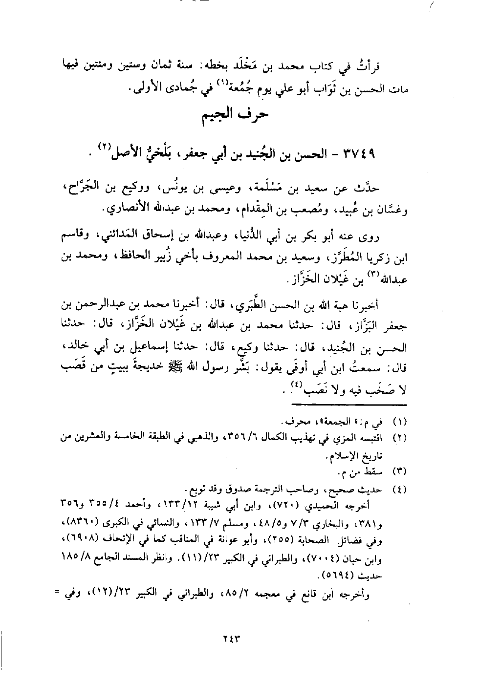 3749 - الْحَسَن بن الجنيد بن أَبِي جَعْفَر بلخي الأصل حدث عَنْ سعيد بن مسلمة، وعيسى بن يونس، ووكيع بن الجراح، وغسان بن عبيد، ومصعب بن المقدام، ومحمد بن عَبْد اللَّهِ الأنصاري.