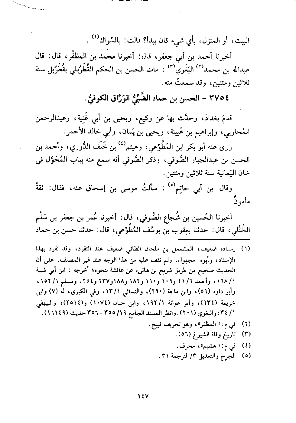 (2413) -[8: 247] أَخْبَرَنَا الْحُسَيْنُ بْنُ شُجَاعٍ الصُّوفِيُّ، قَالَ: أَخْبَرَنَا عُمَرُ بْنُ جَعْفَرِ بْنِ سَلْمٍ الْخُتُلِّيُّ، قَالَ: حَدَّثَنَا يَعْقُوبُ بْنُ يُوسُفَ الْمُطَّوِعِيُّ، قَالَ: حَدَّثَنَا حَسَنُ بْنُ حَمَّادٍ الْوَرَّاقُ، قَالَ: حَدَّثَنَا أَبُو خَالِدٍ الأَحْمَرُ، عَنْ مُجَالِدٍ، عَنِ الشَّعْبِيِّ، عَنْ جَابِرِ بْنِ عَبْدِ اللَّهِ، أَنَّ النَّبِيَّ صَلَّى اللَّهُ عَلَيْهِ وَسَلَّمَ " كَانَ يُجِيزُ شَهَادَةَ الْيَهُودِ بَعْضُهُمْ عَلَى بَعْضٍ " أخبرنا السِّمْسَارُ، قَالَ: أخبرنا الصَّفَّارُ، قَالَ: حَدَّثَنَا ابْنُ قَانِعٍ، أَنَّ الْحَسَنَ بْنَ حَمَّادٍ الْوَرَّاقَ مَات بالكوفة فِي سنة تسع وثلاثين ومائتين.