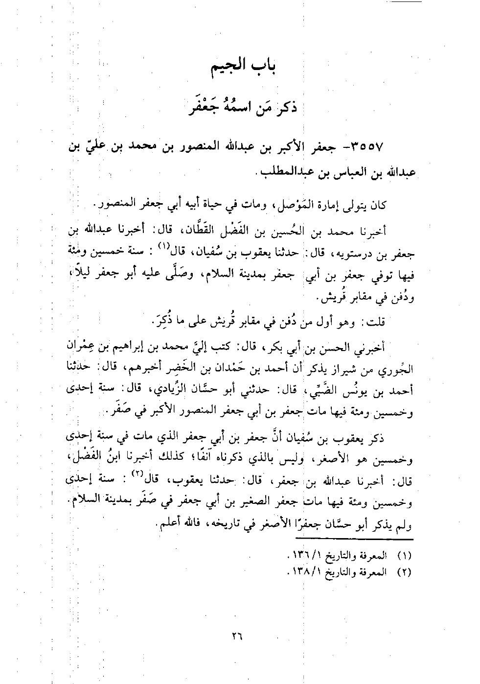 3557 - جعفر الأكبر بن عبد الله المنصور بن مُحَمَّدِ بْنِ عَلِيّ بن عَبْدِ اللَّهِ بْنِ العباس بن عبد المطلب كان يتولى إمارة الموصل، ومات فِي حياة أبيه أبي جعفر المنصور.
