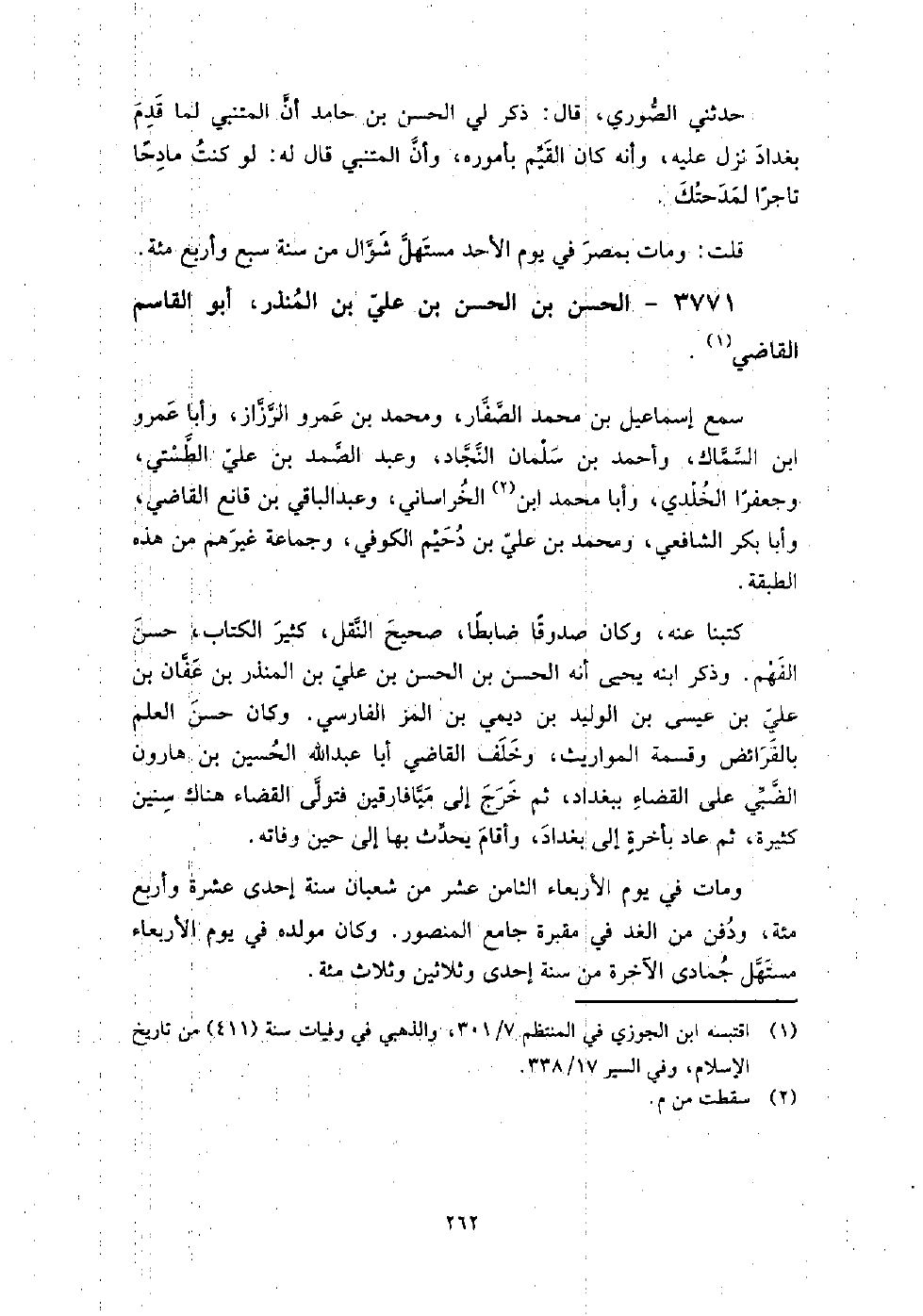 3771 - الْحَسَن بن الْحَسَن بن عَلِيّ بن المنذر أَبُو الْقَاسِمِ الْقَاضِي سمع إِسْمَاعِيل بن مُحَمَّد الصَّفَّار، ومحمد بن عمرو الرزاز، وأبا عمرو ابن السماك، وأحمد بن سلمان النجاد، وعبد الصمد بن عَلِيّ الطستي، وجعفرا الخلدي، وأبا مُحَمَّد ابن الخراساني، وعبد الباقي بن قانع الْقَاضِي، وأبا بكر الشافعي، ومحمد بن عَلِيّ بن دحيم الكوفي، وجماعة غيرهم من هذه الطبقة.