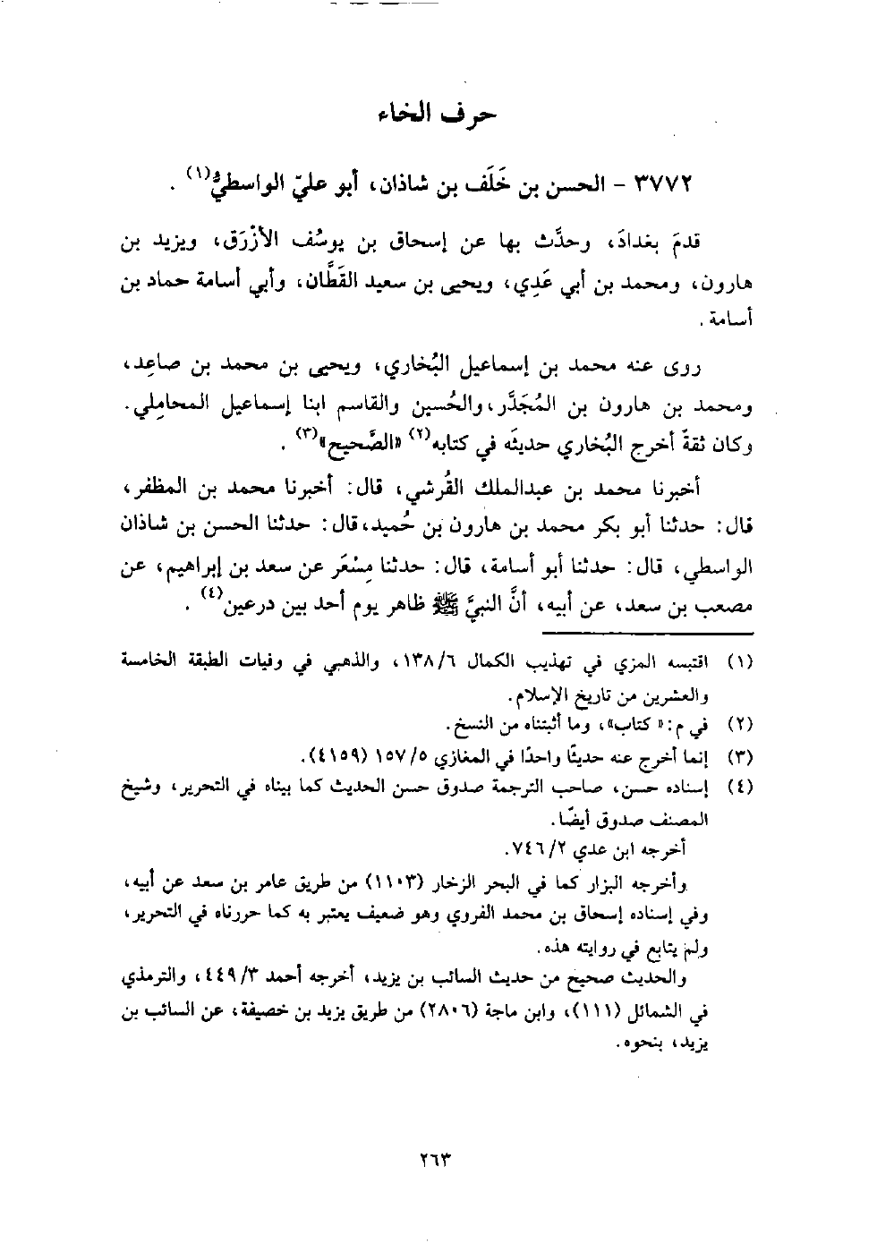 (2420) -[8: 263] أَخْبَرَنَا مُحَمَّدُ بْنُ عَبْدِ الْمَلِكِ الْقُرَشِيُّ، قَالَ: أَخْبَرَنَا مُحَمَّدُ بْنُ الْمُظَفَّرِ، قَالَ: حَدَّثَنَا أَبُو بَكْرٍ مُحَمَّدُ بْنُ هَارُونَ بْنِ حُمَيْدٍ، قَالَ: حَدَّثَنَا الْحَسَنُ بْنُ شَاذَانَ الْوَاسِطِيُّ، قَالَ: حَدَّثَنَا أَبُو أُسَامَةَ، قَالَ: حَدَّثَنَا مِسْعَرٌ، عَنْ سَعْدِ بْنِ إِبْرَاهِيمَ، عَنْ مُصْعَبِ بْنِ سَعْدٍ، عَنْ أَبِيهِ، أَنَّ النَّبِيَّ صَلَّى اللَّهُ عَلَيْهِ وَسَلَّمَ " ظَاهَرَ يَوْمَ أُحُدٍ بَيْنَ دِرْعَيْنِ " قرأت عَلَى أَبِي بكر البرقاني، عَنْ إِبْرَاهِيم بن مُحَمَّدِ بْنِ يَحْيَى المزكي، قَالَ: أخبرنا مُحَمَّدُ بْنُ إِسْحَاق السراج، قَالَ: مات الْحَسَن بن شاذان الواسطي ببغداد سنة ست وأربعين ومائتين.