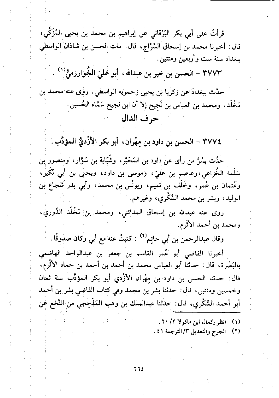 3774 - الْحَسَن بن داود بن مهران أَبُو بَكْرٍ الأزدي المؤدب حدث بسر من رأى عَنْ داود بن المحبر، وشبابة بن سوار، ومنصور بن سَلَمَةَ الخزاعي، وعاصم بن عَلِيّ، وموسى بن داود، ويحيى بن أَبِي بكير، وعثمان بن عُمَر، وخلف بن تميم، ويونس بن مُحَمَّد، وأبي بدر شجاع بن الوليد، وبشر بن مُحَمَّد السكري، وغيرهم.