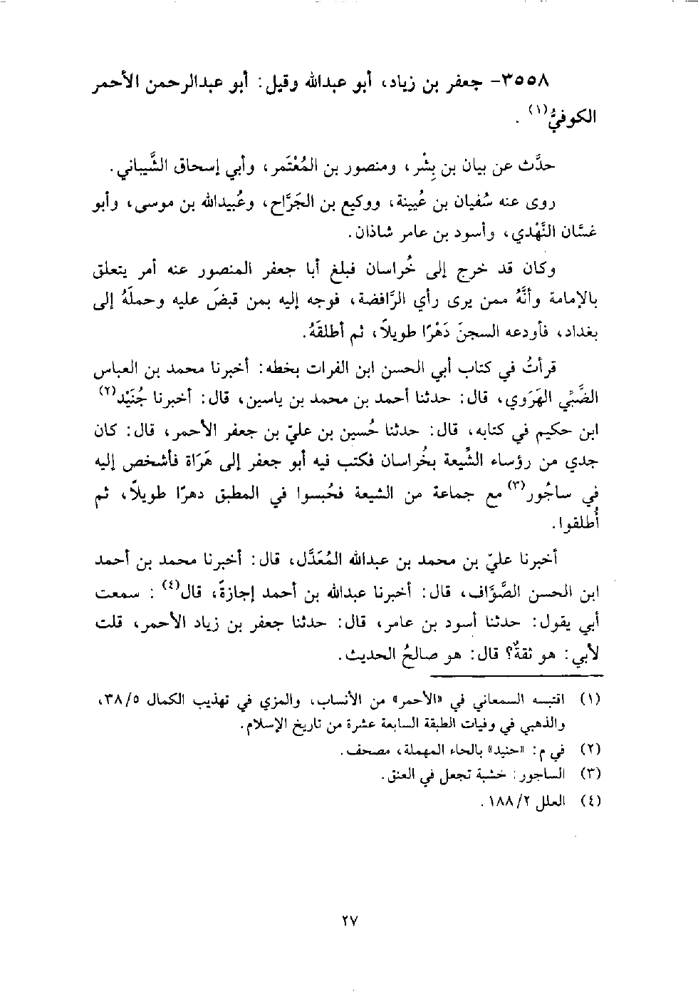 3558 - جعفر بن زياد أَبُو عبد الله، وقيل أَبُو عَبْد الرَّحْمَنِ الأحمر الكوفي حدث عَنْ بيان بن بشر، ومنصور بن المعتمر، وأَبِي إِسْحَاقَ الشيباني.