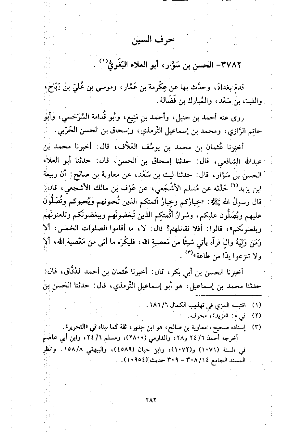 3782 - الْحَسَن بن سوار أَبُو العلاء البغوي قدم بغداد، وحدث بها عَنْ عكرمة بن عمار، وموسى بن عَلِيّ بن رباح، والليث بن سعد، والمبارك بن فضالة.