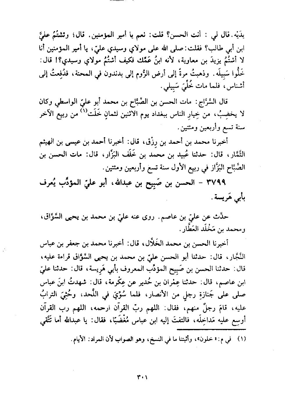 3799 - الْحَسَن بن صبيح بن عَبْد اللَّهِ أَبُو عَلِيّ المؤدب يعرف بأبي هريسة حدث عَنْ عَلِيّ بن عاصم.