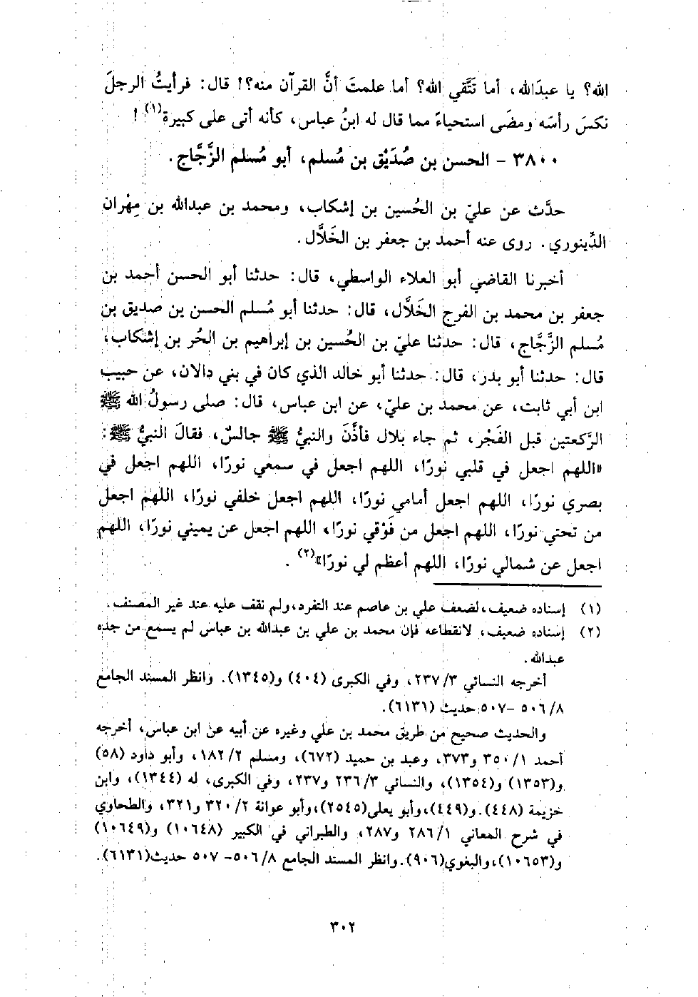 (2436) -[8: 302] أَخْبَرَنَا الْقَاضِي أَبُو الْعَلاءِ الْوَاسِطِيُّ، قَالَ: حَدَّثَنَا أَبُو الْحَسَنِ أَحْمَدُ بْنُ جَعْفَرِ بْنِ مُحَمَّدِ بْنِ الْفَرَجِ الْخَلالُ، قَالَ: حَدَّثَنَا أَبُو مُسْلِمٍ الْحَسَنُ بْنُ صَدِيقِ بْنِ مُسْلِمٍ الزَّجَّاجُ، قَالَ: حَدَّثَنَا عَلِيُّ بْنُ الْحُسَيْنِ بْنِ إِبْرَاهِيمَ بْنِ الْحُرِّ بْنِ إِشْكَابٍ، قَالَ: حَدَّثَنَا أَبُو بَدْرٍ، قَالَ: حَدَّثَنَا أَبُو خَالِدٍ الَّذِي كَانَ فِي بَنِي دَالانَ، عَنْ حَبِيبِ بْنِ أَبِي ثَابِتٍ، عَنْ مُحَمَّدِ بْنِ عَلِيٍّ، عَنِ ابْنِ عَبَّاسٍ، قَالَ: صَلَّى رَسُولُ اللَّهِ صَلَّى اللَّهُ عَلَيْهِ وَسَلَّمَ الرَّكْعَتَيْنِ قَبْلَ الْفَجْرِ، ثُمَّ جَاءَ بِلالٌ فَأَذَّنَ وَالنَّبِيُّ صَلَّى اللَّهُ عَلَيْهِ وَسَلَّمَ جَالِسٌ، فَقَالَ النَّبِيُّ صَلَّى اللَّهُ عَلَيْهِ وَسَلَّمَ: " اللَّهُمَّ اجْعَلْ فِي قَلْبِي نُورًا، اللَّهُمَّ اجْعَلْ فِي سَمْعِي نُورًا، اللَّهُمَّ اجْعَلْ فِي بَصَرِي نُورًا، اللَّهُمَّ اجْعَلْ أَمَامِي نُورًا، اللَّهُمَّ اجْعَلْ خَلْفِي نُورًا، اللَّهُمَّ اجْعَلْ مِنْ تَحْتِي نُورًا، اللَّهُمَّ اجْعَلْ مِنْ فَوْقِي نُورًا، اللَّهُمَّ اجْعَلْ عَنْ يَمِينِي نُورًا، اللَّهُمَّ اجْعَلْ عَنْ شِمَالِي نُورًا، اللَّهُمَّ أَعْظِمْ لِي نُورًا "