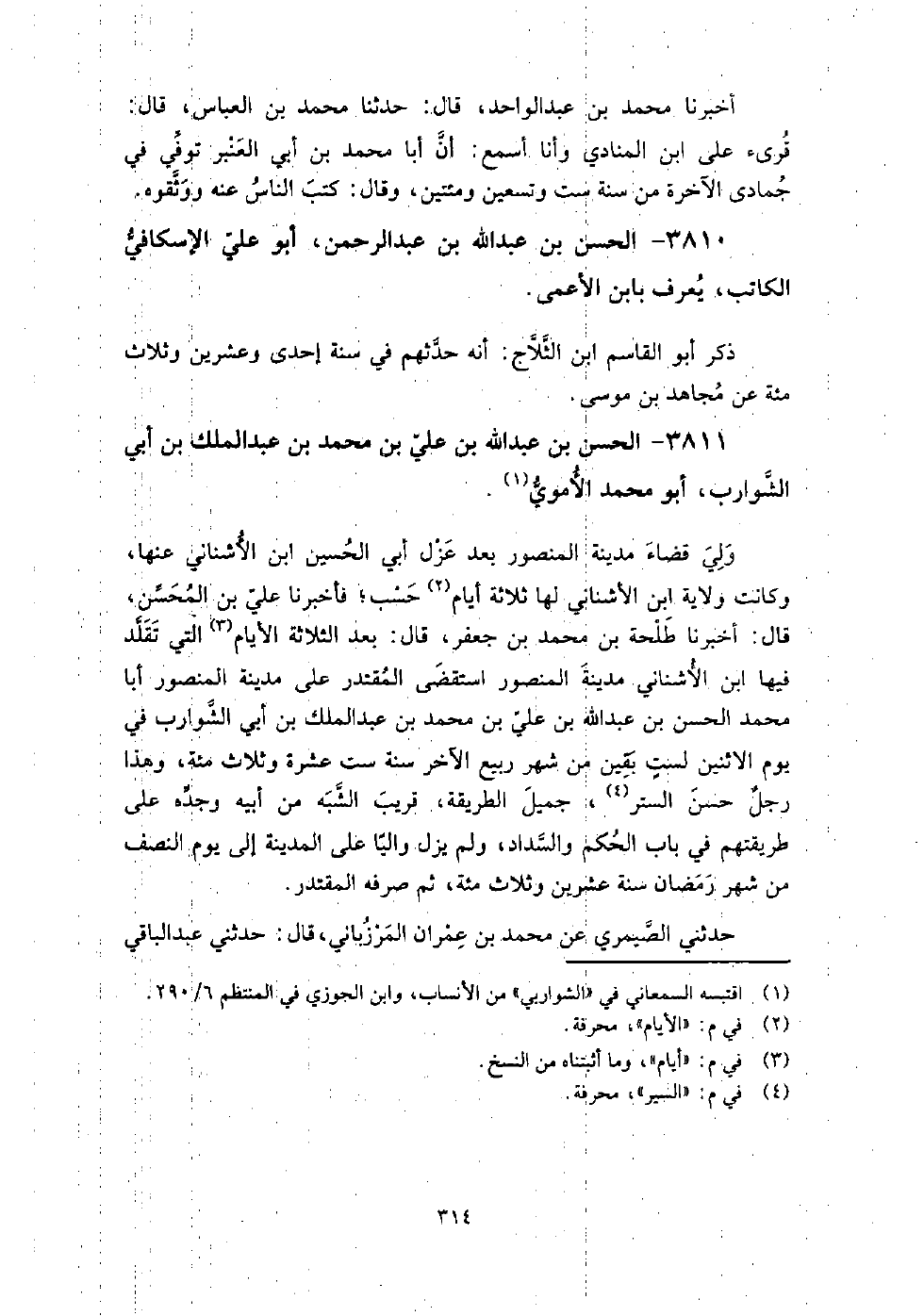 3810 - الْحَسَن بن عَبْدِ اللَّهِ بْنِ عَبْد الرَّحْمَنِ أَبُو عَلِيّ الإسكافي الكاتب يعرف بابن الأعمى ذكر أَبُو الْقَاسِمِ ابن الثلاج: أَنَّهُ حدثهم فِي سنة إحدى وعشرين وثلاث مائة عَنْ مجاهد بن مُوسَى.