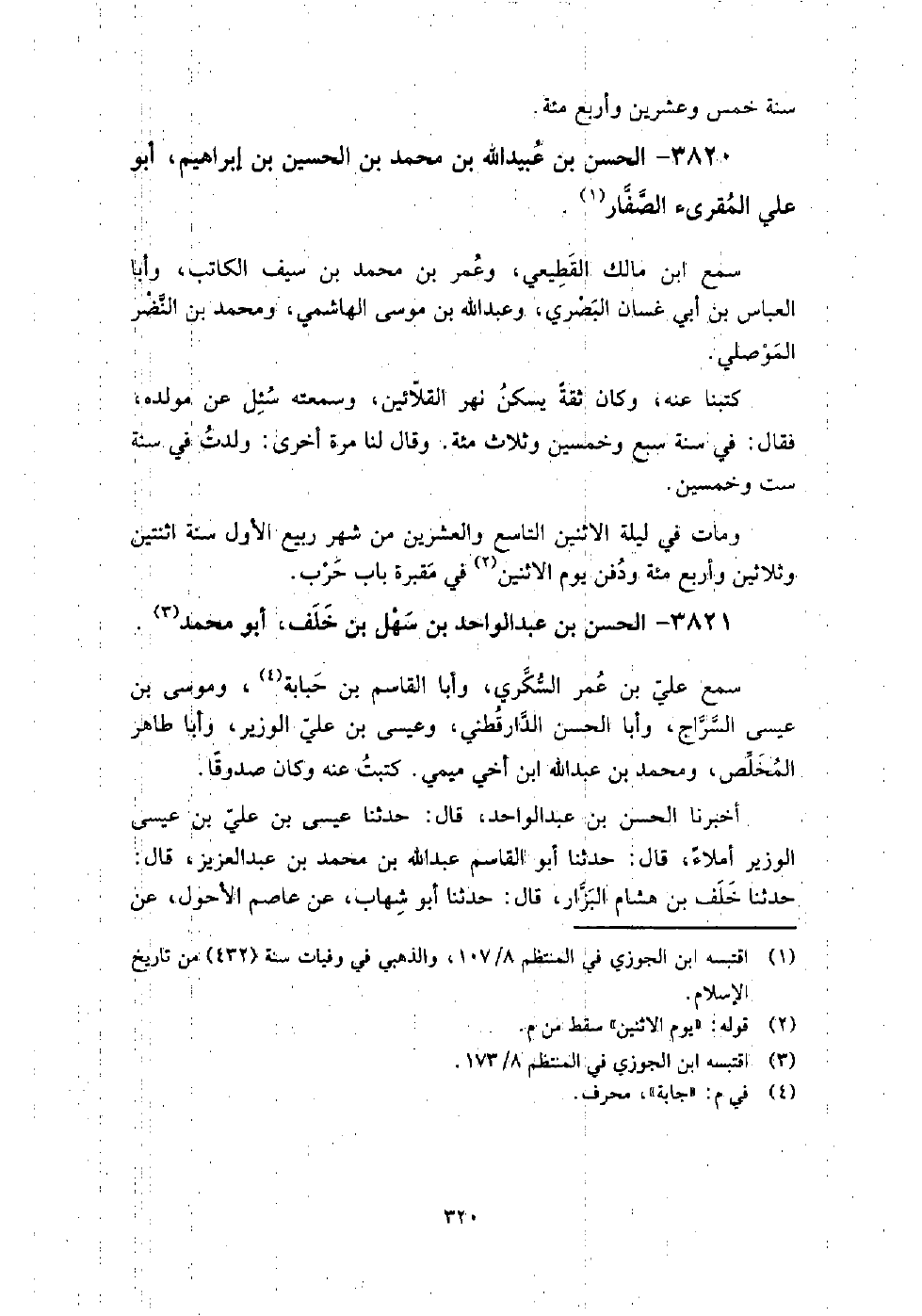 3820 - الْحَسَن بن عُبَيْد اللَّهِ بن مُحَمَّدِ بْنِ الْحُسَيْن بن إِبْرَاهِيم أَبُو عَلِيّ المقرئ الصَّفَّار سمع ابن مالك القطيعي، وعمر بن مُحَمَّدِ بْنِ سيف الكاتب، وأبا الْعَبَّاس بن أَبِي غسان البصري، وعَبْد اللَّهِ بْن مُوسَى الهاشمي، ومحمد بن النضر الموصلي.