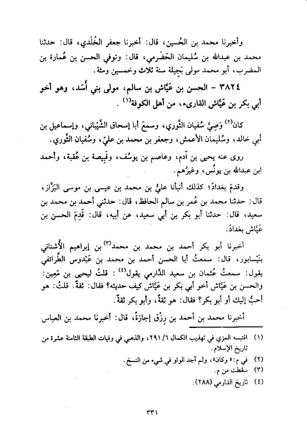 3824 - الْحَسَن بن عياش بن سالم مولى بني أسد وهو أخو أَبِي بكر بن عياش القارئ من أهل الكوفة كَانَ وصي سُفْيَان الثوري، وسمع أبا إِسْحَاق الشيباني، وإسماعيل بن أَبِي خالد، وسليمان الأَعْمَش، وجعفر بن مُحَمَّدِ بْنِ عَلِيّ، وسفيان الثوري.