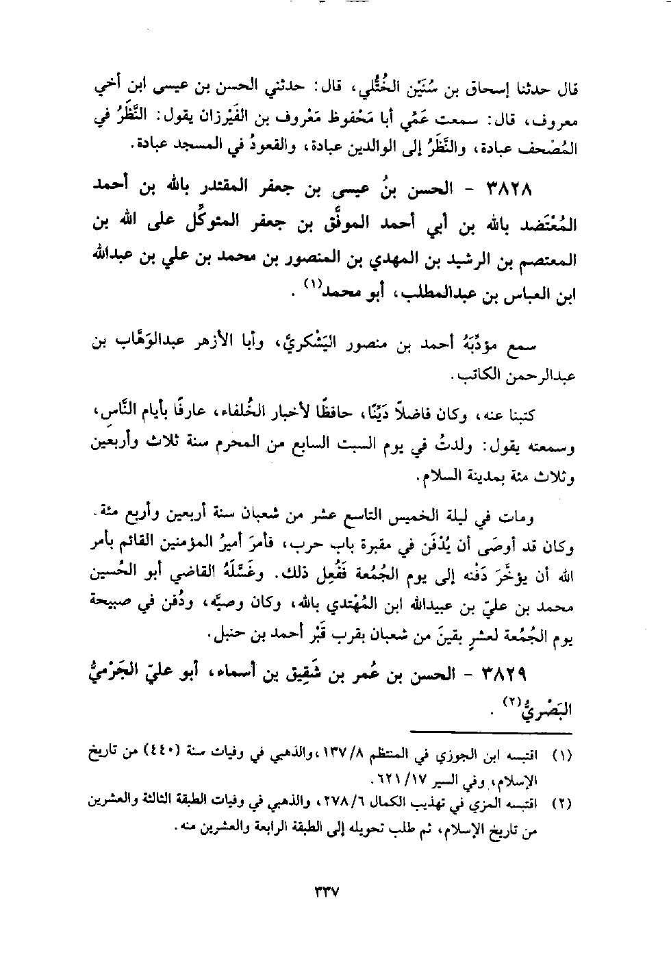 3828 - الْحَسَن بن عِيسَى بن جَعْفَر المقتدر بالله بن أَحْمَد المعتضد بالله بن أَبِي أَحْمَد الموفق بن جَعْفَر المتوكل عَلَى اللَّه بن المعتصم بن الرشيد بن المهدي بن المنصور بن مُحَمَّدِ بْنِ عَلِيّ بن عَبْدِ اللَّهِ بْنِ الْعَبَّاس بن عبد المطلب أَبُو مُحَمَّد سمع مؤدبه أَحْمَد بن مَنْصُور اليشكري، وأبا الأزهر عبد الوهاب بن عَبْد الرَّحْمَنِ الكاتب.