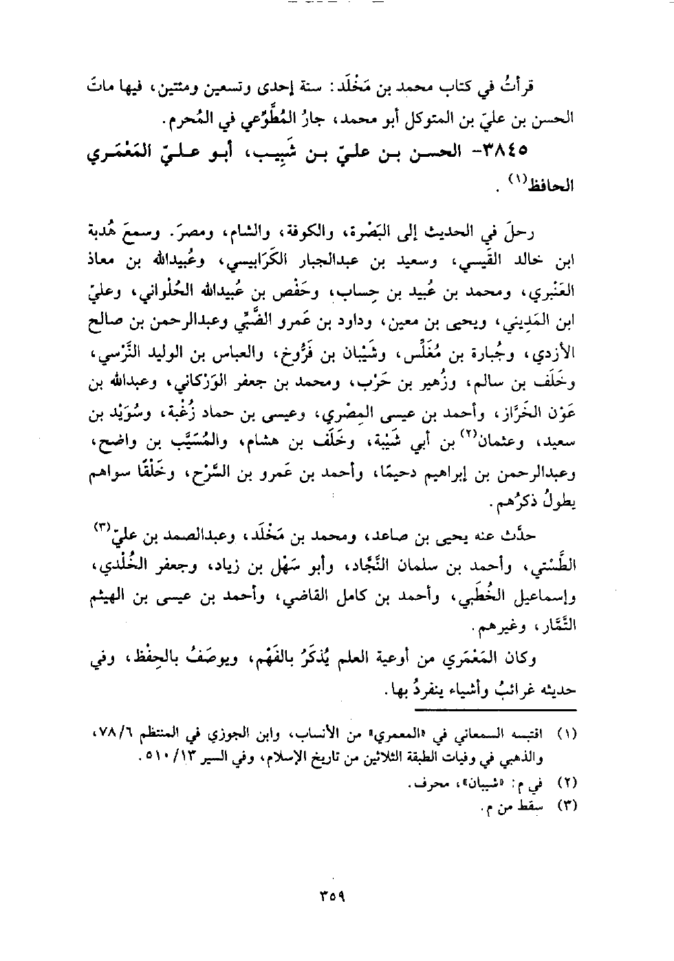 3845 - الْحَسَن بن عَلِيّ بن شبيب أَبُو عَلِيّ المعمري الْحَافِظ رحل فِي الحديث إِلَى البصرة، والكوفة، والشام، ومصر.