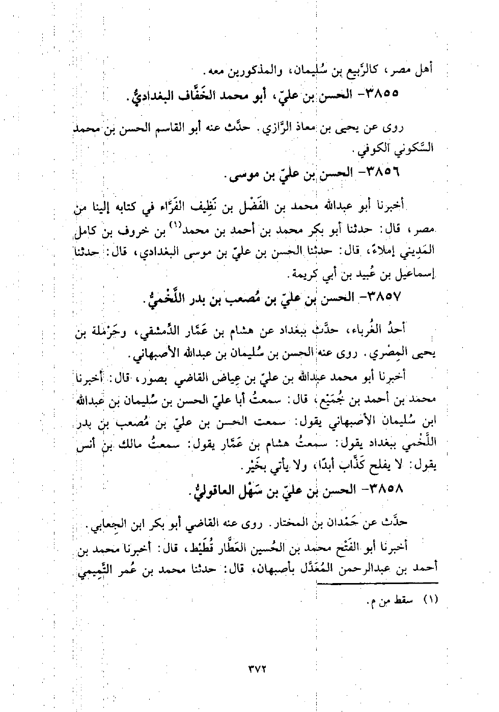 3857 - الْحَسَن بن عَلِيّ بن مصعب بن بدر اللخمي أحد الغرباء، حدث ببغداد عَنْ هشام بن عمار الدمشقي، وحرملة بن يَحْيَى المصري.