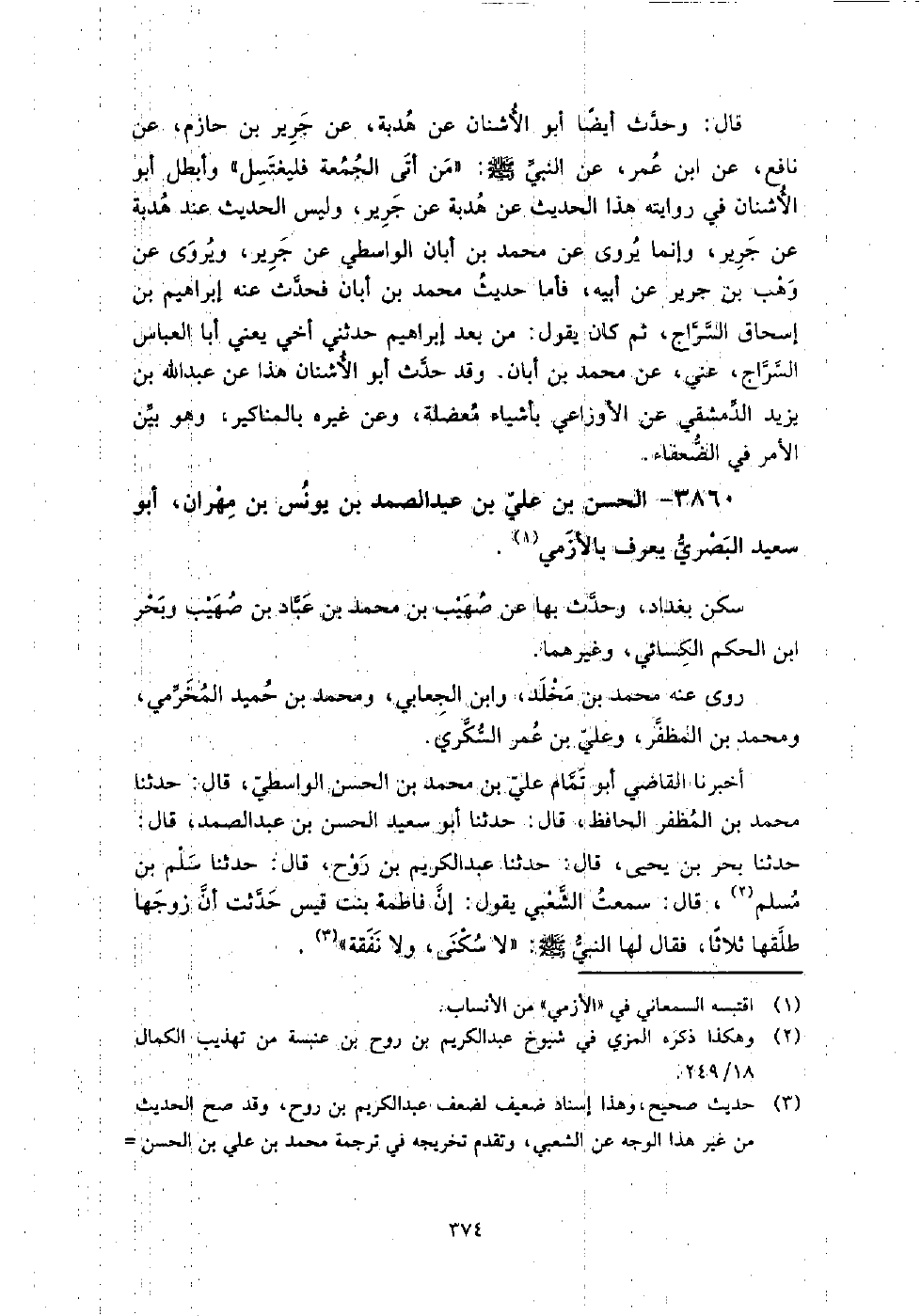 3860 - الْحَسَن بن عَلِيّ بن عبد الصمد بن يونس بن مهران أَبُو سعيد البصري يعرف بالأزمي سكن بغداد، وحدث بها عَنْ صهيب بن مُحَمَّدِ بْنِ عباد بن صهيب، وبحر بن الحكم الكسائي، وغيرهما.