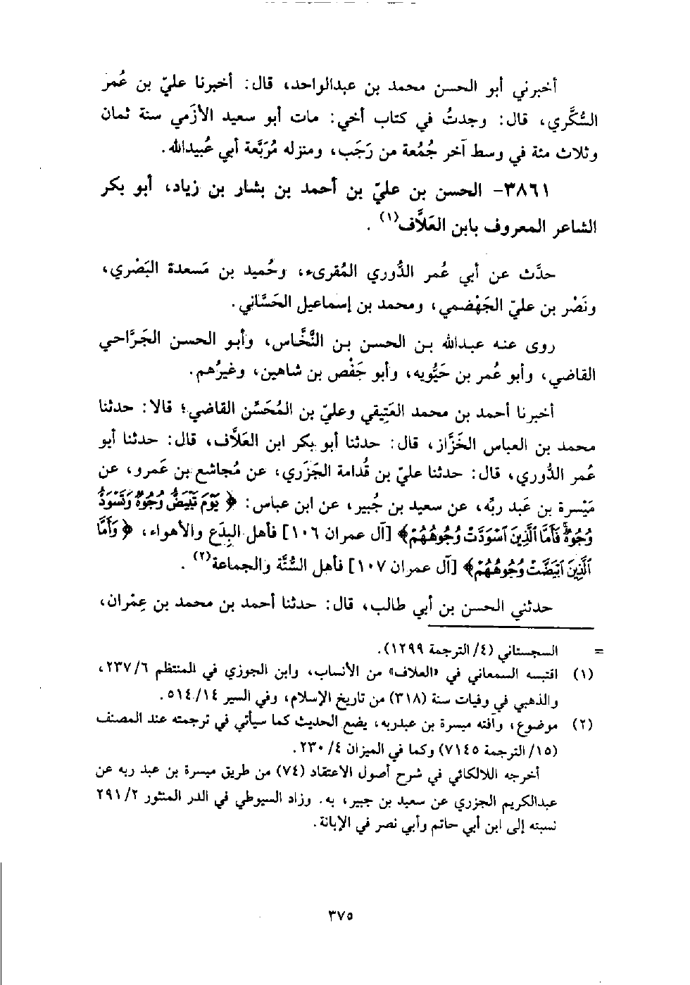 (2469) أَخْبَرَنَا أَحْمَدُ بْنُ مُحَمَّدٍ الْعَتِيقِيُّ وَعَلِيُّ بْنُ الْمُحَسِّنِ الْقَاضِي، قَالا: حَدَّثَنَا مُحَمَّدُ بْنُ الْعَبَّاسِ الْخَزَّازُ، قَالَ: حَدَّثَنَا أَبُو بَكْرِ بْنُ الْعَلافِ، قَالَ: حَدَّثَنَا أَبُو عُمَرَ الدُّورِيُّ، قَالَ: حَدَّثَنَا عَلِيُّ بْنُ قُدَامَةَ الْجَزَرِيُّ، عَنْ مُجَاشِعِ بْنِ عَمْرٍو، عَنْ مَيْسَرَةَ بْنِ عَبْدِ رَبِّهِ، عَنْ سَعِيدِ بْنِ جُبَيْرٍ، عَنِ ابْنِ عَبَّاسٍ {يَوْمَ تَبْيَضُّ وُجُوهٌ وَتَسْوَدُّ وُجُوهٌ فَأَمَّا الَّذِينَ اسْوَدَّتْ وُجُوهُهُمْ} فَأَهْلُ الْبِدَعِ وَالأَهْوَاءِ، {وَأَمَّا الَّذِينَ ابْيَضَّتْ وُجُوهُهُمْ} فَأَهْلُ السُّنَّةِ وَالْجَمَاعَةِ حَدَّثَنِي الْحَسَن بن أَبِي طالب، قَالَ: حَدَّثَنَا أَحْمَدُ بْنُ مُحَمَّد بن عمران، قَالَ: حَدَّثَنِي الغمر بن مُحَمَّد، قَالَ: حَدَّثَنَا أَبُو بَكْرٍ الْحَسَن بن عَلِيّ بن بشار العلاف الشاعر بمجلس أَبِي الْحَسَن الأخفش، قَالَ: صك لي عَلَى عَلِيّ بن يَحْيَى برزق، فأعطاني دنانير وأمر أن لا أحتسب بها عليه، فكتبت إليه بهذه الأبيات، وذكر أن أبا هفان كتبها بيده: