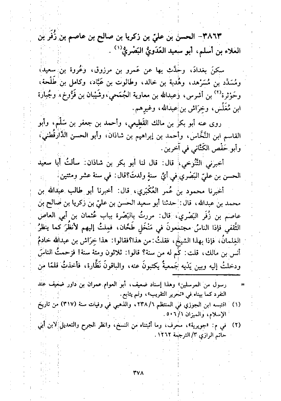 3863 - الْحَسَن بن عَلِيّ بن زكريا بن صالح بن عاصم بن زفر بن العلاء بن أسلم أَبُو سعيد العدوي البصري سكن بغداد، وحدث بها عَنْ عمرو بن مرزوق، وعروة بن سعيد، ومسدد بن مسرهد، وهدبة بن خالد، وطالوت بن عباد، وكامل بن طلحة، وحوثرة بن أشرس، وعَبْد اللَّهِ بْن معاوية الجمحي، وشيبان بن فروخ، وجبارة بن مغلس، وخراش بن عَبْد اللَّهِ، وغيرهم.