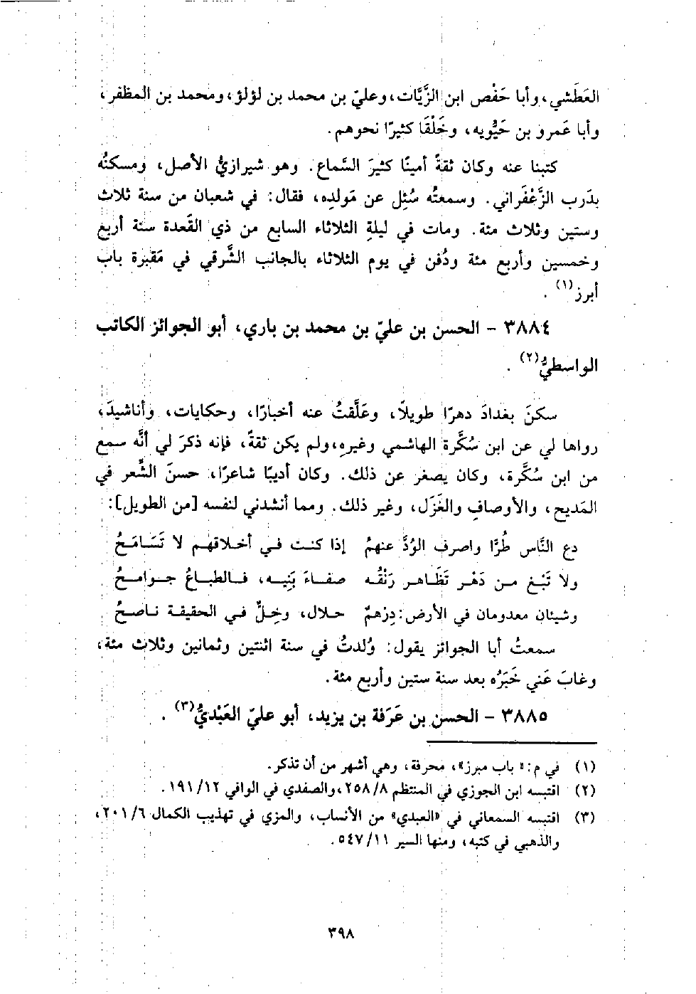 3884 - الْحَسَن بن عَلِيّ بن مُحَمَّدِ بْنِ باري أَبُو الجوائز الكاتب الواسطي سكن بغداد دهرا طويلا، وعلقت عنه أخبارا، وحكايات، وأناشيد رواها لي عَنِ ابن سكرة الهاشمي، وغيره، ولم يكن ثقة، فإنه ذكر لي أَنَّهُ سمع من ابن سكرة، وكان يصغر عَنْ ذلك.