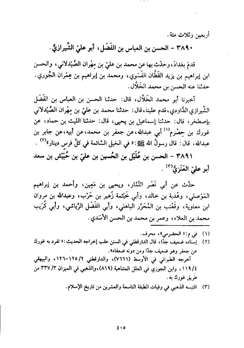 3890 - الْحَسَن بن الْعَبَّاس بن الفضل أَبُو عَلِيّ الشيرازي قدم بغداد، وحدث بها عَنْ مُحَمَّد بن عَلِيّ بن مهران الصيدلاني، والحسن بن إِبْرَاهِيم بن يزيد الْقَطَّان الفسوي، ومحمد بن إِبْرَاهِيم بن عمران الجوري.