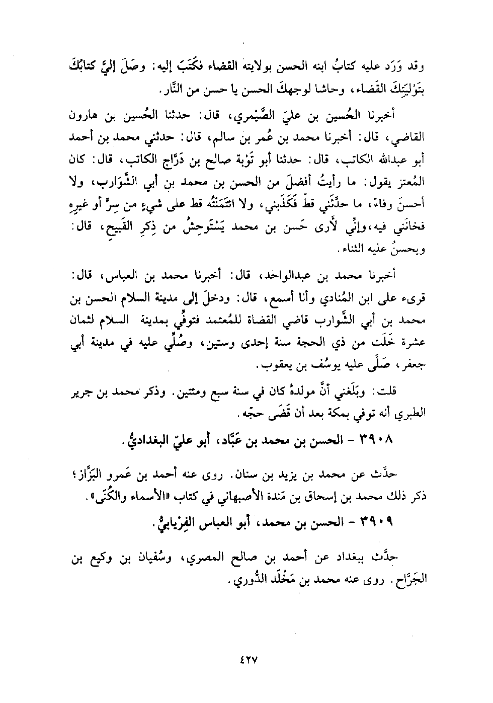 3909 - الْحَسَن بن مُحَمَّد أَبُو الْعَبَّاس الفريابي حدث ببغداد عَنْ أَحْمَد بن صالح المصري، وسفيان بن وكيع بن الجراح.