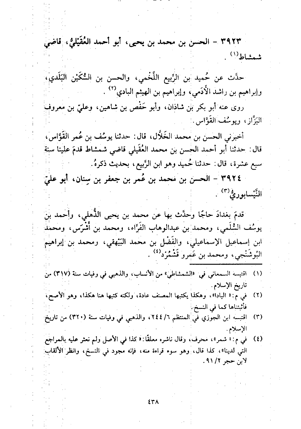 3923 - الْحَسَن بن مُحَمَّدِ بْنِ يَحْيَى أَبُو أَحْمَد العقيلي قاضي شمشاط حدث عَنْ حميد بن الربيع اللخمي، والحسن بن السكين البلدي، وإبراهيم بن راشد الآدمي، وإبراهيم بن الهيثم البادي.