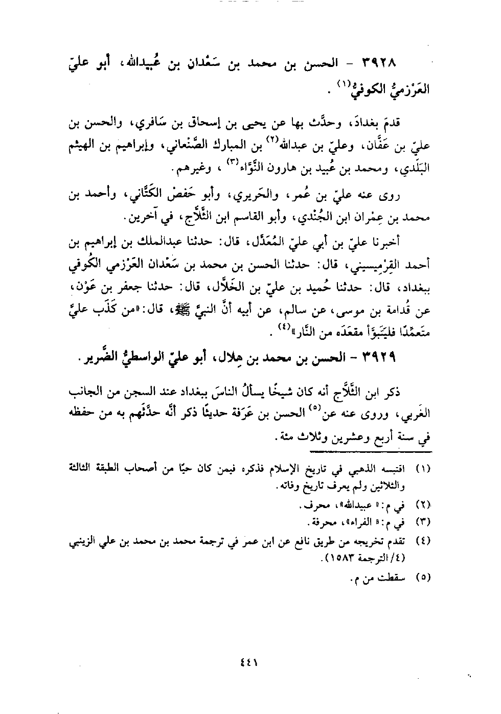 3928 - الْحَسَن بن مُحَمَّدِ بْنِ سعدان بن عُبَيْد اللَّهِ أَبُو عَلِيّ العرزمي الكوفي قدم بغداد، وحدث بها عَنْ يَحْيَى بن إِسْحَاق بن سافري، والحسن بن عَلِيّ بن عفان، وعلي بن عبد اللَّهِ بن المبارك الصنعاني، وإبراهيم بن الهيثم البلدي، ومحمد بن عبيد بن هارون النَّوَّاء، وغيرهم.