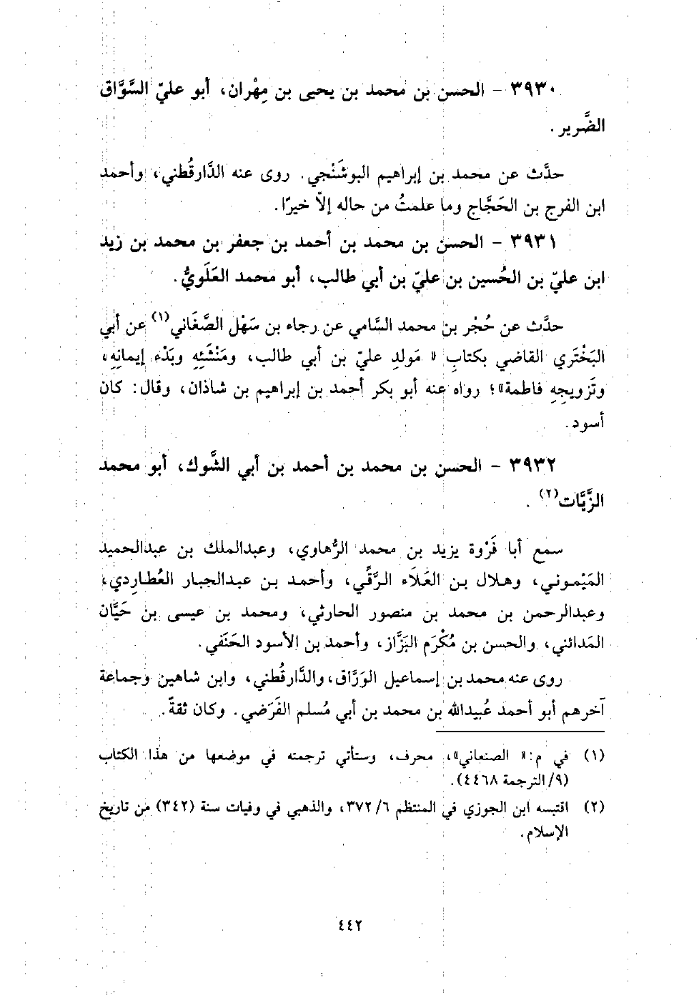 3932 - الْحَسَن بن مُحَمَّدِ بْنِ أَحْمَدَ بْنِ أَبِي الشوك أَبُو مُحَمَّد الزيات سمع أبا فروة يزيد بن مُحَمَّد الرهاوي، وعبد الملك بن عبد الحميد الميموني، وهلال بن العلاء الرقي، وأحمد بن عبد الجبار العطاردي، وعَبْد الرَّحْمَنِ بن مُحَمَّدِ بْنِ مَنْصُور الحارثي، ومحمد بن عِيسَى بن حيان المدائني، والحسن بن مكرم البزاز، وأحمد بن الأسود الحنفي.