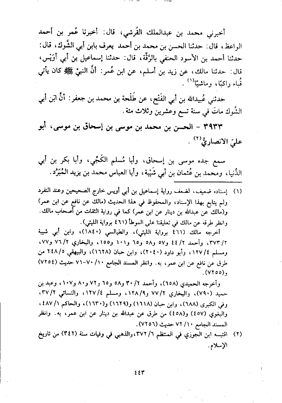 3933 - الْحَسَن بن مُحَمَّدِ بْنِ مُوسَى بن إِسْحَاق بن مُوسَى أَبُو عَلِيّ الأنصاري سمع جده مُوسَى بن إِسْحَاق، وأبا مسلم الكجي، وأبا بكر بن أَبِي الدنيا، ومحمد بن عُثْمَان بن أَبِي شيبة، وأبا الْعَبَّاس مُحَمَّد بن يزيد المبرد.