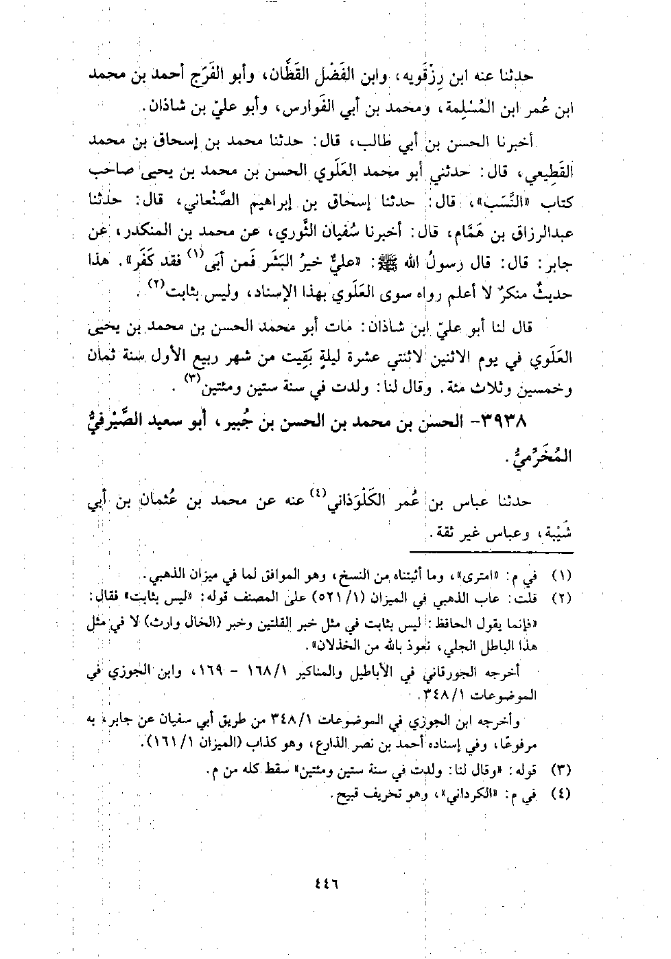3938 - الْحَسَن بن مُحَمَّدِ بْنِ الْحَسَن بن جبير أَبُو سعيد الصيرفي المخرمي حَدَّثَنَا عباس بن عُمَر الكلوذاني، عنه، عَنْ مُحَمَّد بن عُثْمَان بن أَبِي شيبة، وعباس غير ثقة.