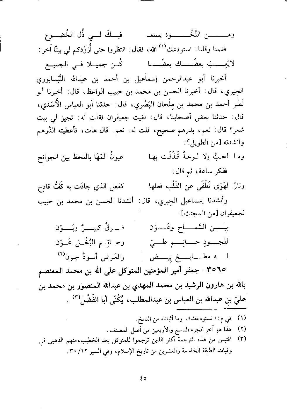 أخبرني الحسين بن عَلِيّ الصيمري، قَالَ: حَدَّثَنَا مُحَمَّدُ بْنُ عمران بن مُوسَى، قَالَ: أنشدني أحمد بن زياد، قَالَ: أنشدني أَبُو الغوث يَحْيَى بن البحتري لأبيه يهجو ابن أبي دؤاد ويخاطب المتوكل: